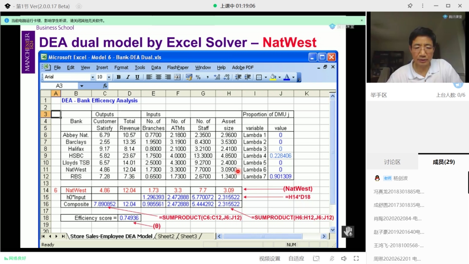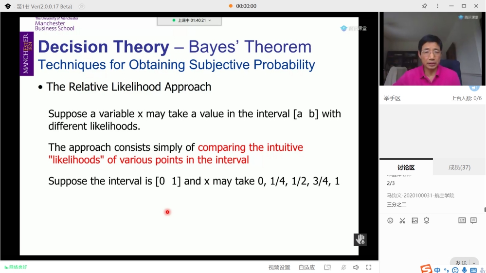 此次“Risk, Performance and Decision Analysis / 风险,绩效与决策分析”课程共32学时,Jian-Bo Yang教授采用腾讯课堂进行线上授课。在授课过程中,他从基本概念、理论方法、实例模型等方面为我校学生讲授了风险与决策树分析、效用决策理论、贝叶斯决策理论、多准则决策分析、数据包络分析与效率评估等内容。针对讲授的不同决策方法模型,Jian-Bo Yang教授结合自己承担的研究项目和当前的最新研究成果,给出了具体的项目实例,与学生进行了深入的分析与讨论。此外,Jian-Bo Yang教授还分享了团队自主开发的智能决策系统工具软件,供同学们学习与研究。授课结束后,Jian-Bo Yang教授以Course Report的形式对学生进行成绩考核。