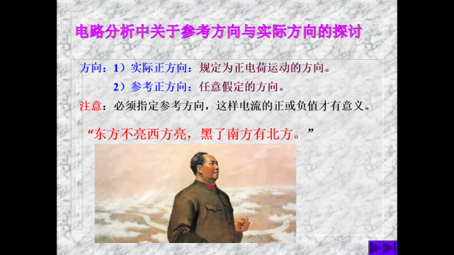 “参考方向可以任意选,选好了之后计算结果若为正,那么实际方向就与你所选的方向一致,若结果为负,则意味着所选方向与实际方向相反。”对于高中已经习惯了使用实际方向解决问题的同学们,尹老师又开始了他的神操作“东方不亮西方亮,黑了南方有北方。”毛泽东主席的名言也成了解决问题的利器。“这句话本来是毛主席告诉我们,只要坚持不懈地奋斗,总能在某一方面有所突破,取得成功。如果回到我们电路中方向问题的话,我们也可以把这句话引申为:只要选定一个参考方向,认真求解,总能够得到一个结果,而结果的正负正是确定实际的方向的依据。从此实际方向不再是困扰我们求解问题的羁绊。”就是这样电路基础课程入门阶段的难点,被消弭于无形。既让学生在无形中体会了毛主席革命乐观主义思想,又走出了“方向”问题的困惑。
