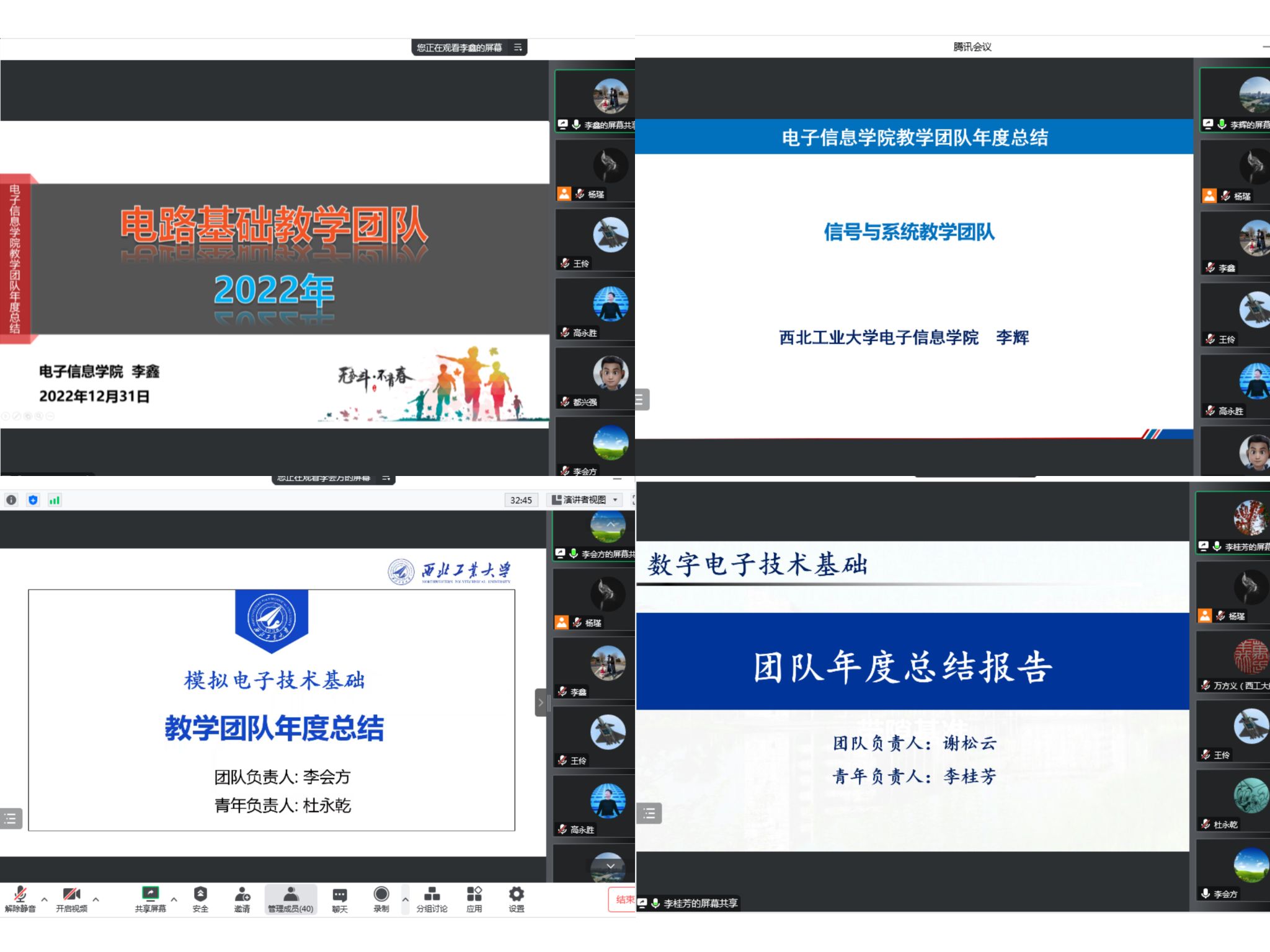 为认真学习贯彻党的二十大精神,落实学校一流本科人才培养行动计划,进一步推进基层教学组织建设,培养可持续发展的教师队伍,根据《电子信息学院教学团队建设与管理办法》文件精神,2022年12月31日,电子信息学院线上召开了首批8个本科教学团队年终考核评审会。评审会特邀材料学院副院长王永欣、航空学院副院长万方义、计算机学院副院长郭斌、电子信息学院院长王伶、副书记高敏、副院长姚如贵、张洵颖、高永胜及教师代表万国宾组成评审小组。各教学团队负责人、成员参加了本次评审会。