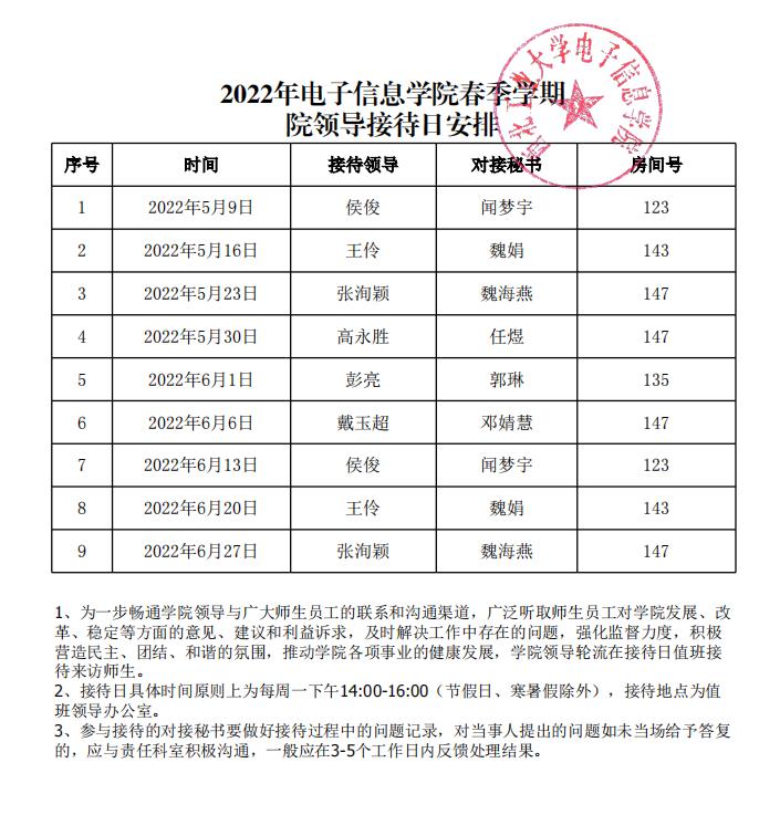 2022年电子信息学院春季学期 院领导接待日安排