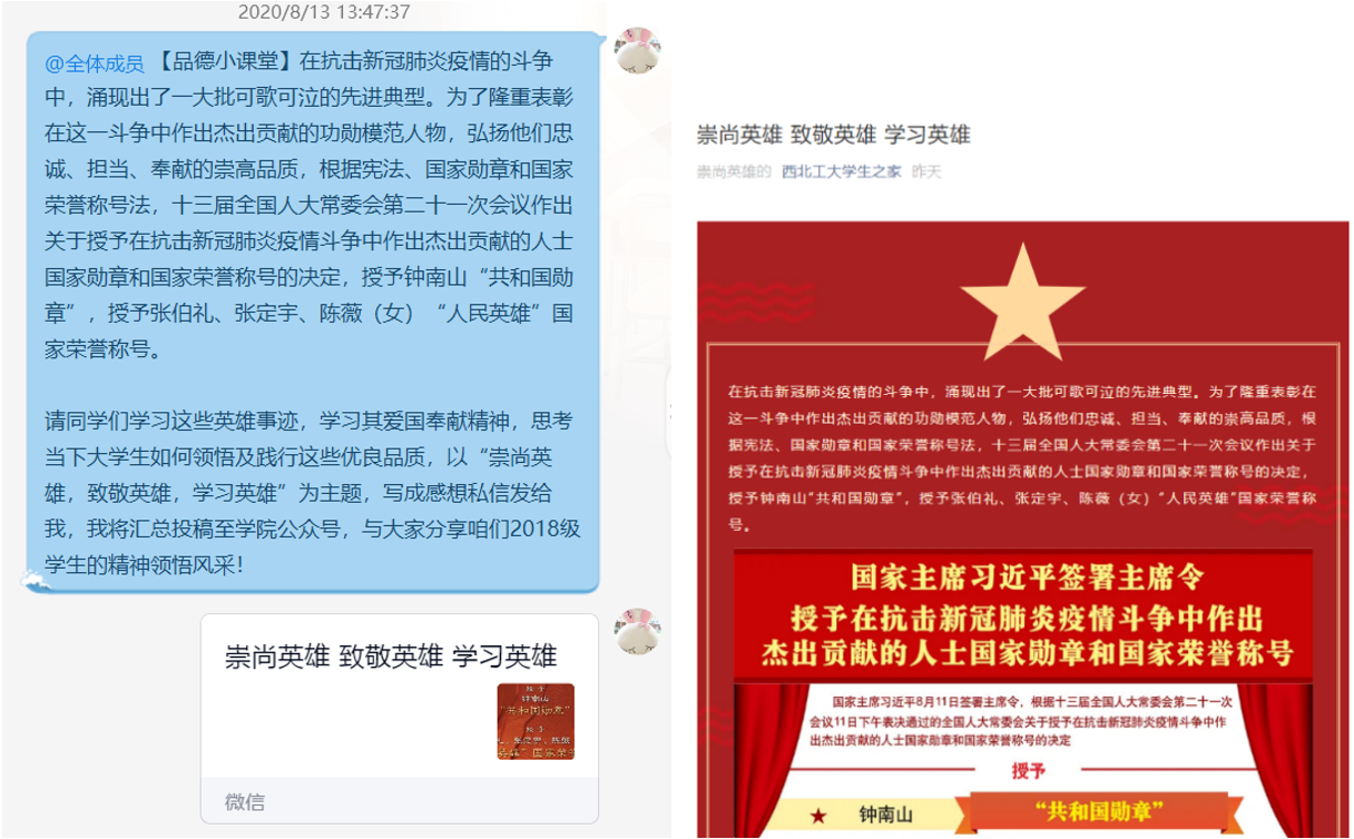 为了鼓励大家学习在抗击新冠肺炎疫情的斗争中所涌现出的先进典型,电子信息学院2018级本科F1岗辅导员樊晔开设了一期【品德小课堂】。“品德小课堂”是电子信息学院“1+5+X”的学生价值塑造培养体系中的举措之一,教育引导学生坚定理想信念、厚植爱国主义情怀、加强品德修养、增长知识见识、培养奋斗精神、增强综合素质,努力培养德智体美劳全面发展的社会主义建设者和接班人。本期“品德小课堂”带领同学们学习在抗击新冠肺炎疫情的斗争中的英雄事迹,学习其爱国奉献精神,并引导学生思考当下大学生如何领悟及践行这些优良品质。