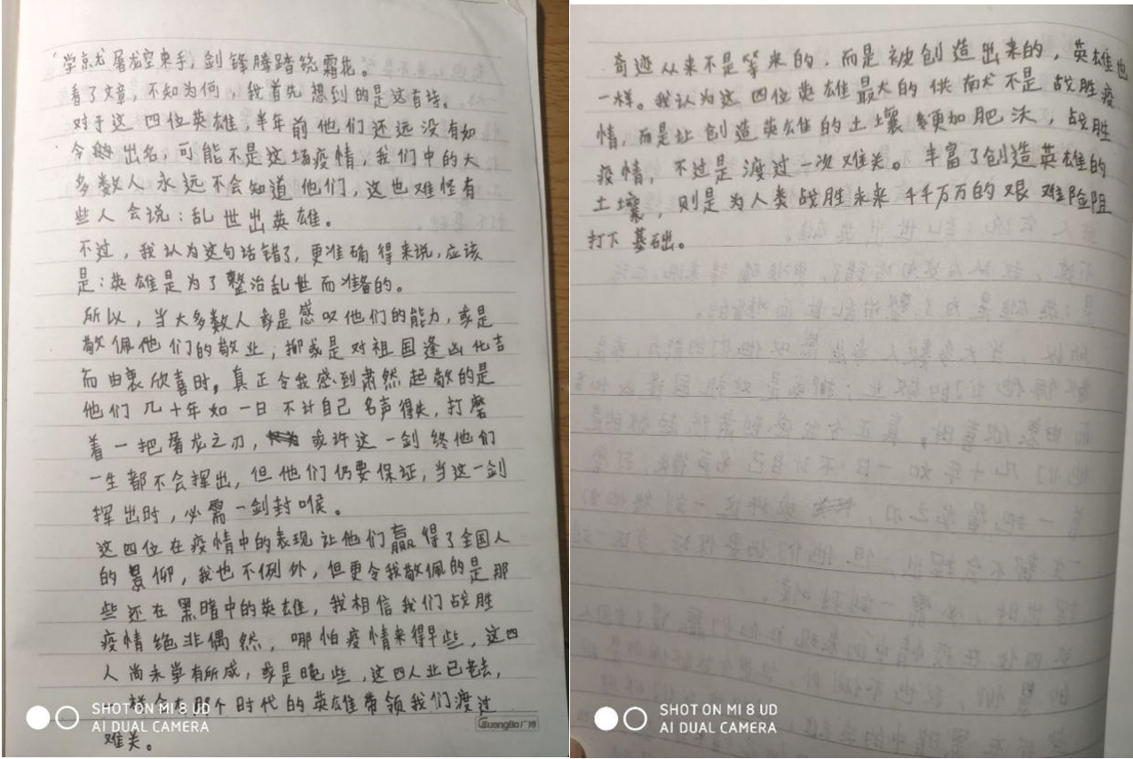 在中华上下五千年的历史里,英雄一直层出不穷,从古时的岳飞,文天祥,杨家将等,到近代历史里的梁启超,孙中山先生,还有许许多多的抗日英雄。如今,在现代发达的网络社会里,英雄更多,他们的事迹也被更多人所了解,所熟知。从最美教师,最美警察,到这次疫情里面以及最近频发的洪水中的大大小小的英雄,他们每个人都在为自己的国家在做贡献,他们都有着满满的爱国情怀,他们都有着过人的品质值得我们去学习,他们值得我们去尊敬,去学习,去憧憬。在敬仰他们的同时,我们也要努力成为我们所敬佩的英雄的样子,我们也许无法做出像钟南山院士,陈薇女士那样的贡献,但我们至少可以从现在开始,学习那些英雄的品质,将自己能做好的事情到达极致,也是在为我们中国变得更好尽一份力。