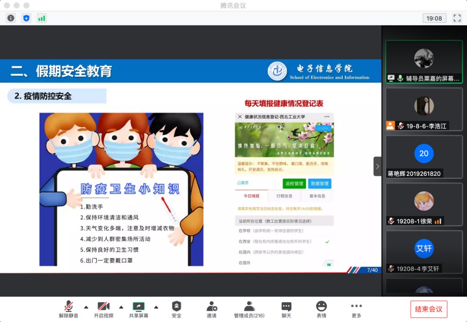 本硕博各年级辅导员先后通过线上的方式召开了大班会,开展暑期学生安全教育,内容包括:学生离校前彻底清理宿舍卫生并检查宿舍安全,关好门窗、关闭房间电源,彻底消除安全隐患;假期内外出要注意防疫安全、人生安全、财产安全、交通安全,避免前往中高风险区域,不参与大规模集会活动,做好安全防护工作;留校学生不得随意出入学校,有事外出需告知辅导员并请假,返校需销假;学院对留校学生坚持疫情“日报告、零报告”制度,每天对留校学生进行全面精细排查;注意网络安全与文明,禁止使用网络暴力,维护网络环境稳定。