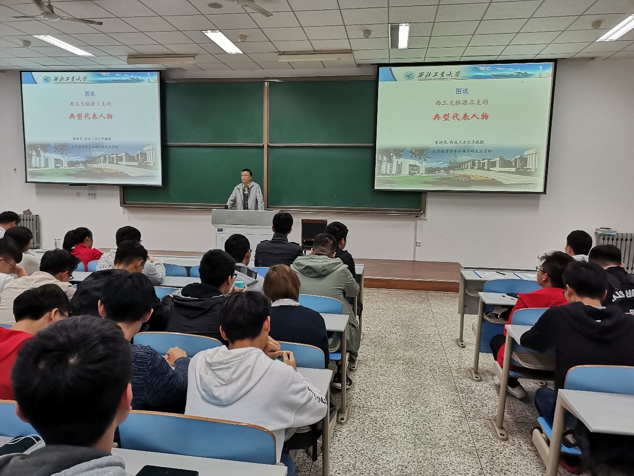 10月11日晚18:00,电子信息学院入党积极分子中级班、发展对象培训班教学正式开始,西北工业大学高等教育学专业硕士研究生导师黄迪民教授深入浅出形象生动地为学员们讲解“图说西工大脉源三支的典型代表人物”。
