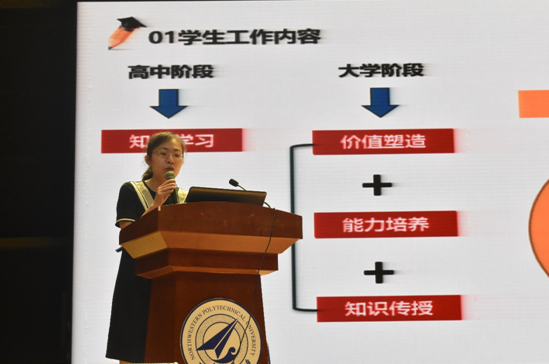 最后,2019级新生辅导员代表胡晓宇老师为大家做了学生日常管理规定的介绍,胡晓宇老师首先从学生的权利与义务讲起,向全体新生及家长明确了学生在校学习期间的权利及义务;接着做了学生违纪及相关处分的说明,并着重强调了部分常见违纪违规行为及学生公寓管理相关规定;最后向全体新生详细介绍了三位辅导员老师,并提出了日常管理要求,如早签到晚自习制度、请销假制度等。学校及学院完善详细的管理制度、强大的学生工作队伍等为学生们的成长成才提供了重要保障,给学生和家长们吃了一颗定心丸。