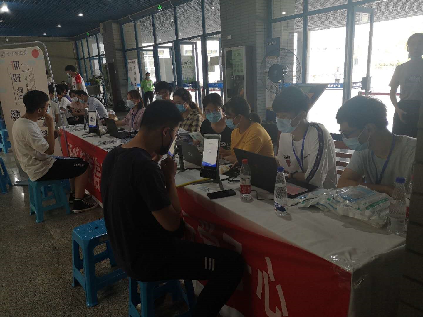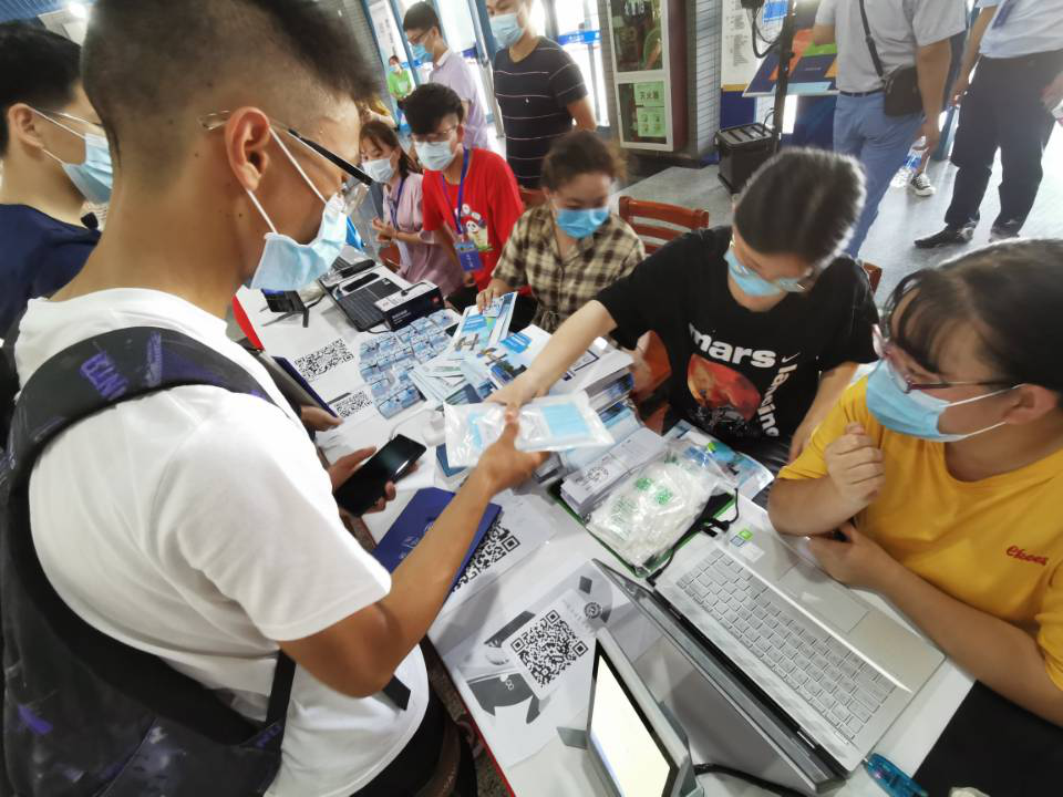 新生们首先来到内场注册点处,通过人脸识别与身份信息以及录取信息核对进行报到。同时,领取一卡通、选课手册等物品及口罩和手套等防疫物资。