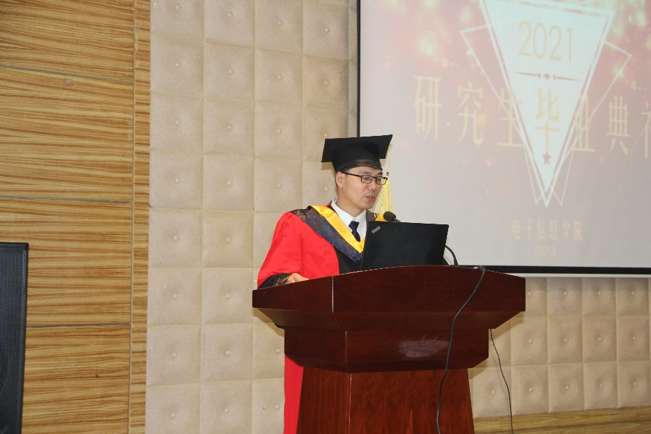 伴塔铃,含英咀华,桃李三千承雨露;望风涛,怀瑾握瑜,贤才四海展鹏程。3月22日下午,电子信息学院举行2021届研究生毕业典礼,学院领导李春林、王伶、冯晓毅、尹熙鹏、彭亮,以及优秀教师代表周巍、姚如贵、戴玉超、张若南、梁军利等出席典礼。典礼由研究生辅导员冀璐阳主持。