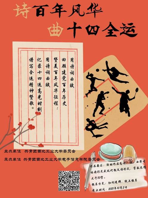 “江山代有才人出,各领风骚数百年。”古诗词是中国古代文人独具特色的文学艺术创作形式,是中华民族艺术宝库的重要组成部分。在中国共产党建党百年华诞及中华人民共和国第十四届运动会举办之际,为厚植学生家国情怀,提振文化自信,西北工业大学电子信息学院团委面向全校开展以“诗百年风华,曲十四全运”为主题的诗词创作活动。