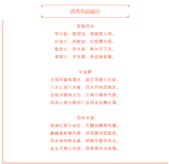 “诗是无形画,画是有形诗。”在同学们的作品中,有沿用古体赞颂十四运中运动健儿们“与日月兮齐光”,还有通过现代诗抒发对中国共产党百年华诞的祝福与展望。