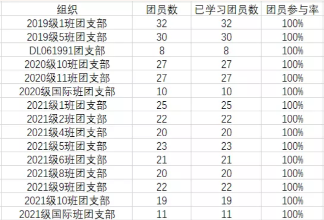 而08061803、08061806、19208-1、19208-3、19208-4、19208-6、20208-6团支部团员参与率较低,希望这些支部在后续的学习中可以提高积极性,按时完成学习任务。