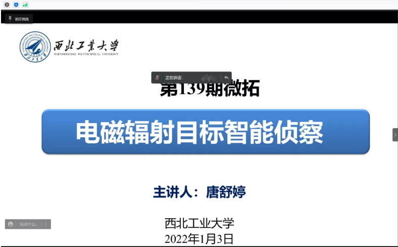 12月29日晚,由我校党委学工部主办,电子信息学院承办的“微拓”-WE TALK学术沙龙第139期在线上举行。本次活动主题是《电磁辐射目标智能侦察》,主讲人为电子信息学院2020级研究生唐舒婷。活动伊始,主讲人向大家介绍了利用电磁辐射特征刻画目标特性的研究现状,阐述了传统电子侦察面临的挑战,并指出如何利用智能化手段实现自适应、可解释、灵活地处理目标电磁信号已成为电磁辐射目标智能侦察的关键核心。随后,围绕电磁辐射目标智能侦察中的处理流程,主讲人向大家介绍了高效率信号分选和高准确率电磁辨识两个核心技术。最后,随着主讲人分享自己研究生期间的科研心得与体会,本次微拓活动圆满结束。