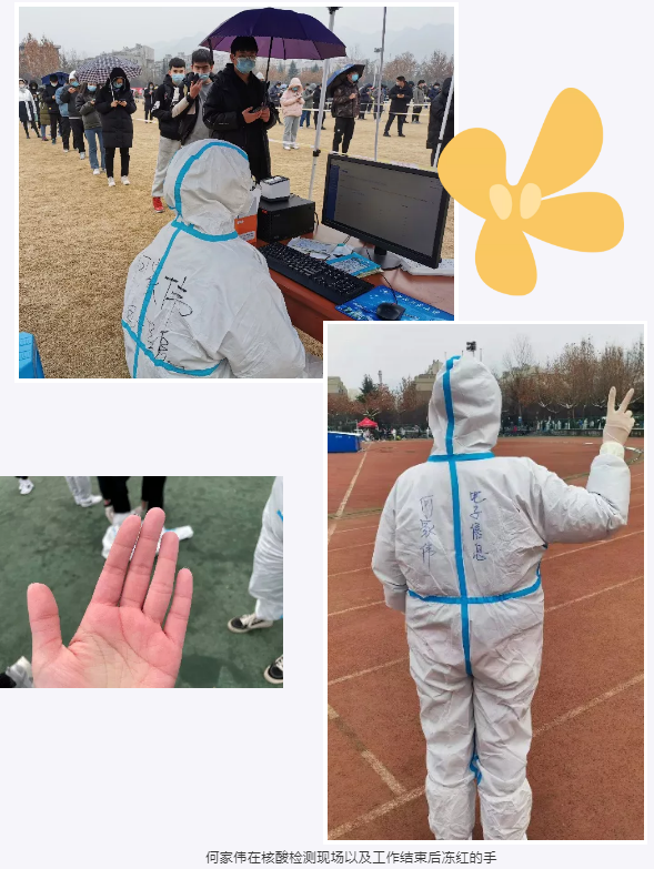 何家伟,电子信息学院研究生。她两次报名核酸检测志愿者。12月23日,连续工作四个小时。12月27日,从下午三点工作到晚上九点,连续工作六个小时。