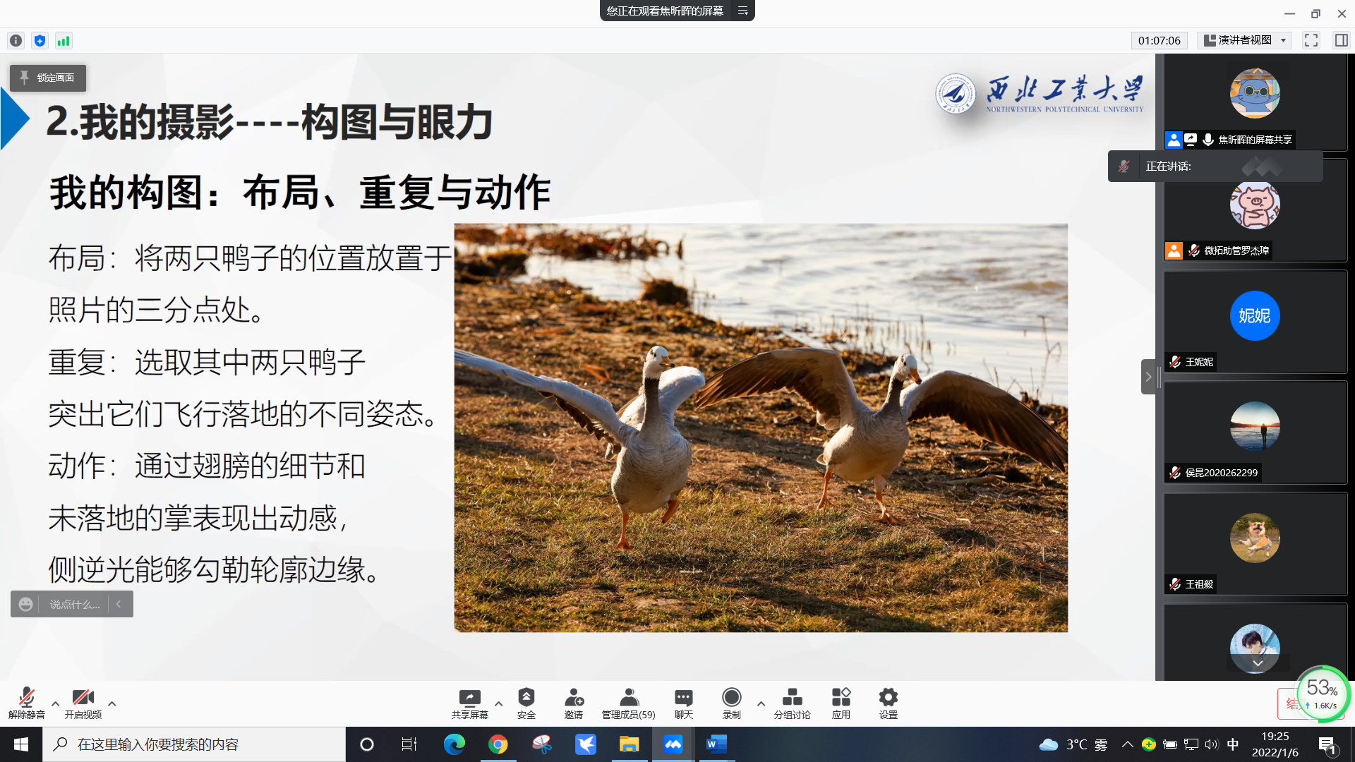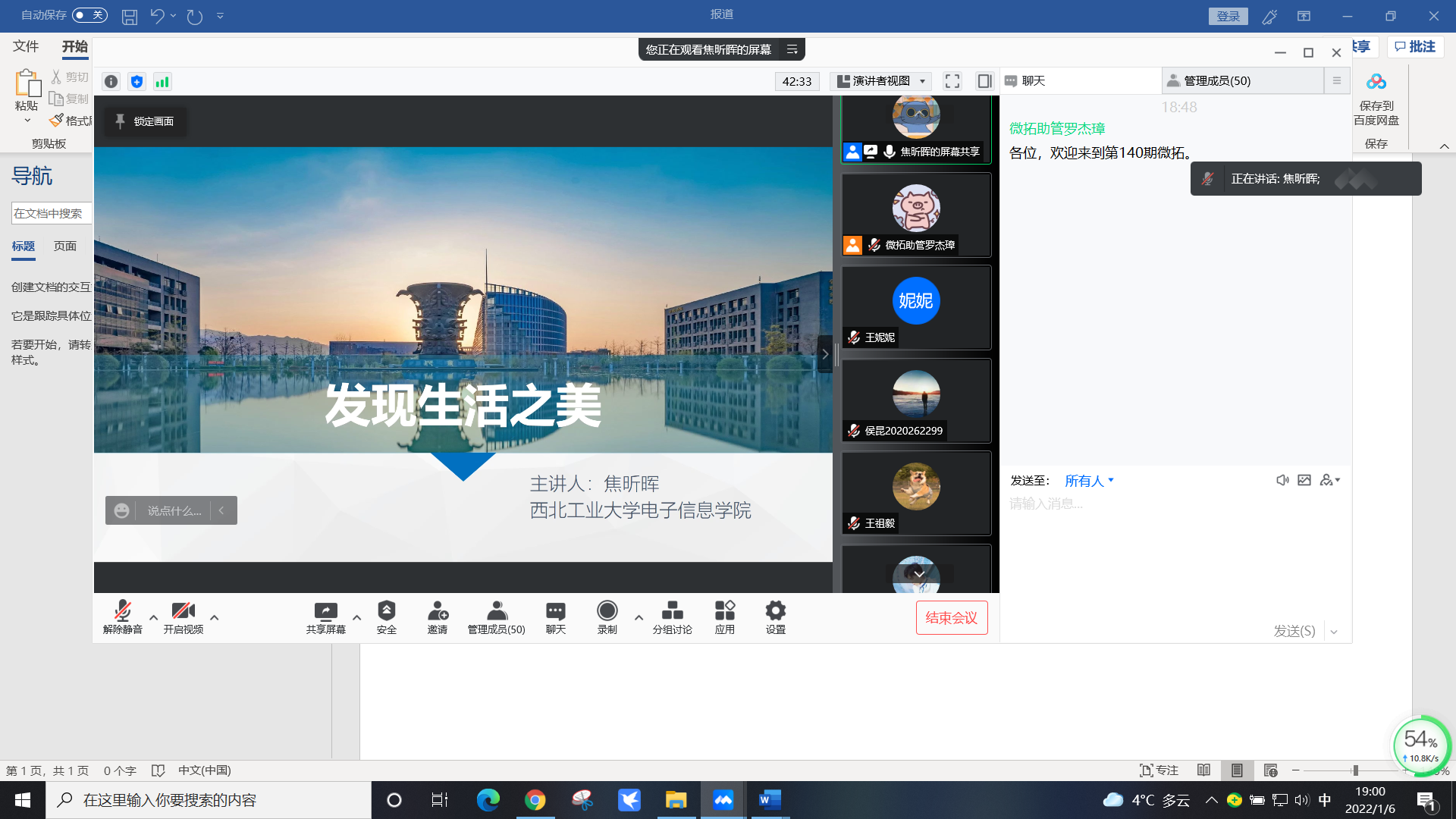1月6日晚,由我校党委学工部主办,电子信息学院承办的“微拓”-WE TALK学术沙龙第140期以线上会议的形式举行。本次活动主题为《发现生活之美》,主讲人是电子信息学院2020级博士生焦昕晖。在本期微拓活动中,焦昕晖分享了自己在科研和生活的经历与收获,还结合自己对摄影的理解,通过实际例子介绍了如何拍摄一张具有美感的照片、如何利用镜头捕捉校园内外的精彩瞬间,并讨论了图画与摄影艺术之间的相互关系。焦昕晖的分享激发了大家对摄影的兴趣,同学们纷纷表示受益匪浅。