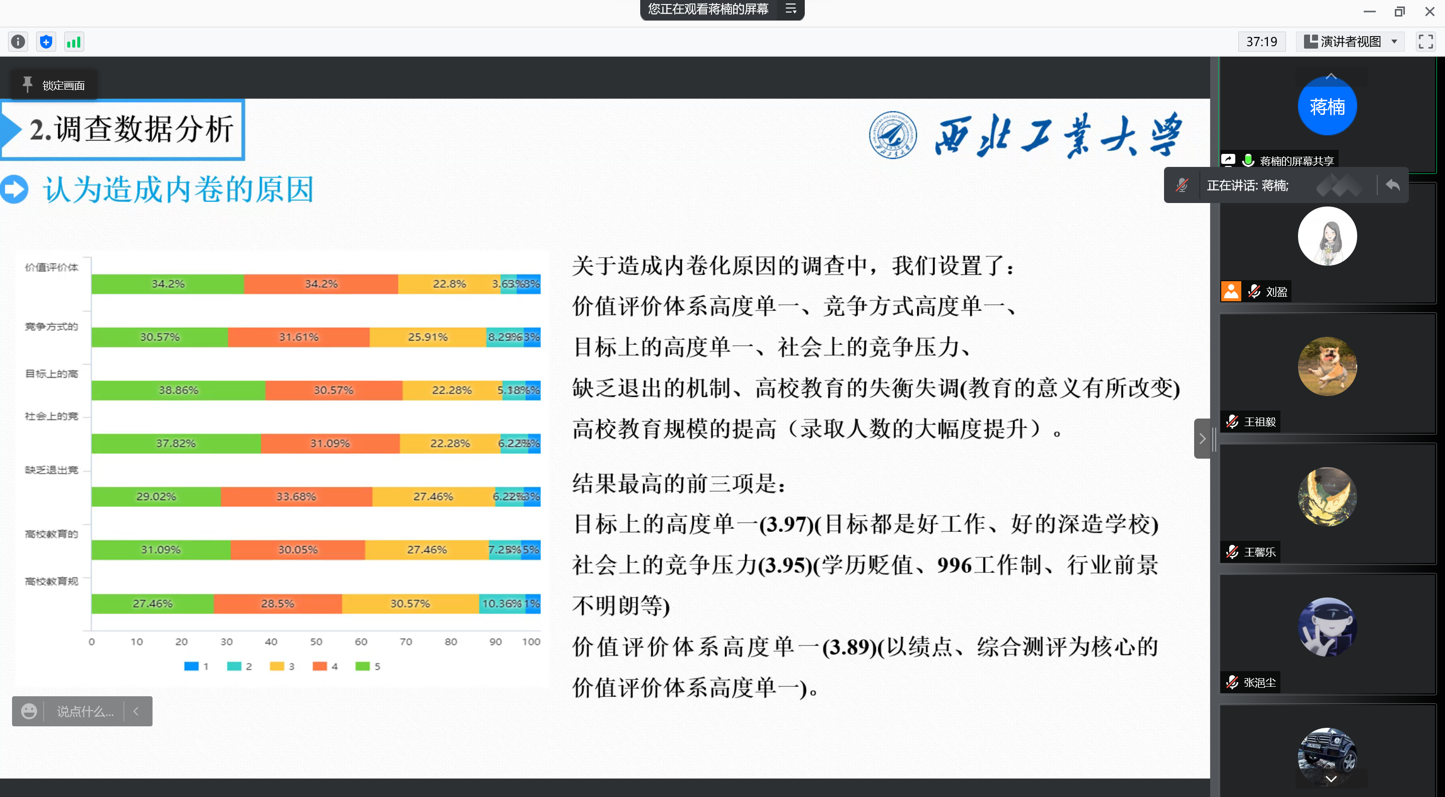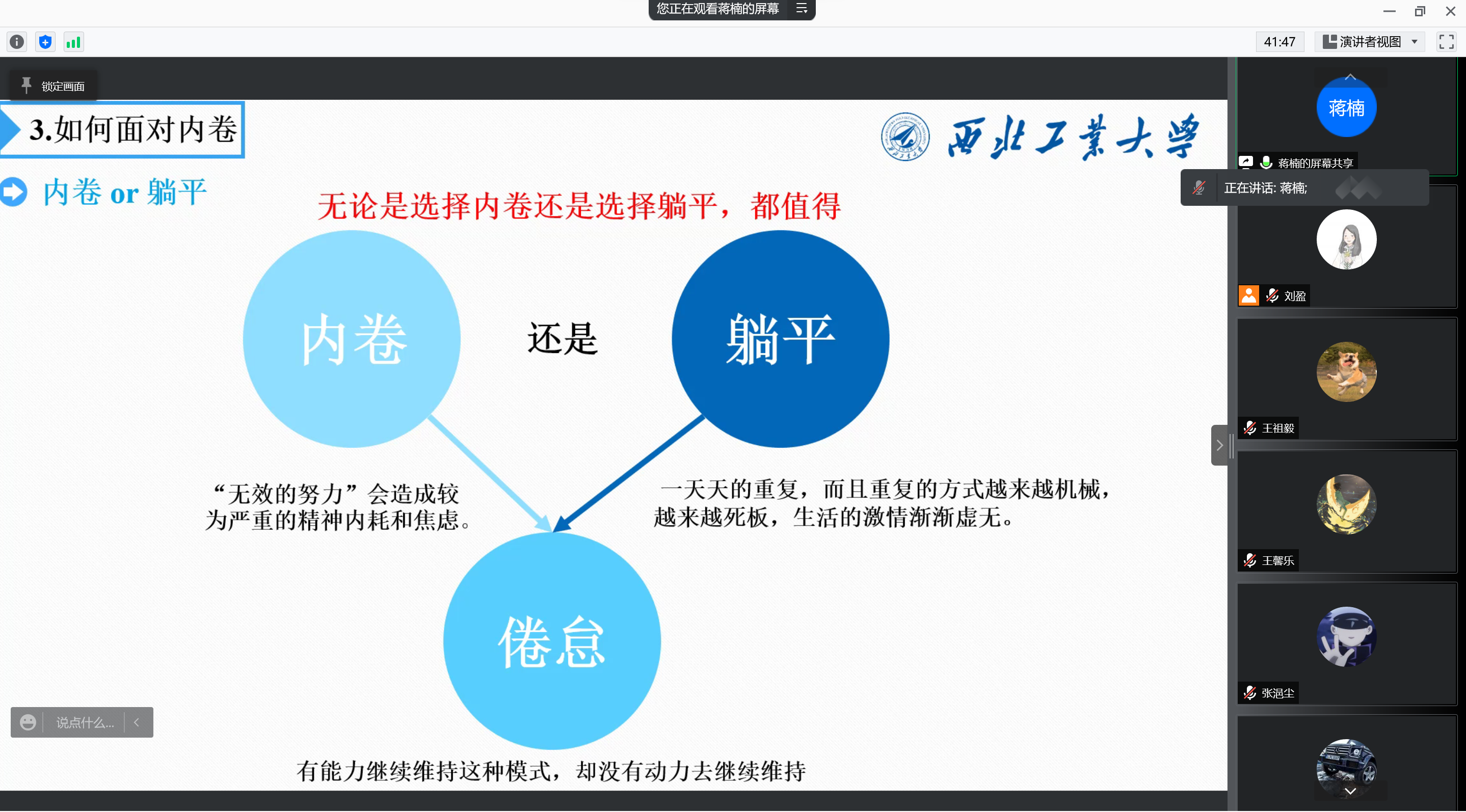 1月15日晚,由我校党委学工部主办,电子信息学院承办的“微拓”-WE TALK学术沙龙第144期在线上举行。本次活动主题为《摆脱倦怠——我校内卷化调查结果的分享》,主讲人为电子信息学院探测制导与控制技术专业2019级本科生蒋楠。蒋楠首先以内卷的来源与发展、内卷的涵义和概念为出发点,向大家详细地介绍了内卷这一现象。随后,通过其参与的一项关于内卷化的调查,他向大家分享了我校内卷化现象的调研结果。同时,对于如何应对内卷、摆脱倦怠,蒋楠提出了自己的独到见解,使大家受益匪浅。