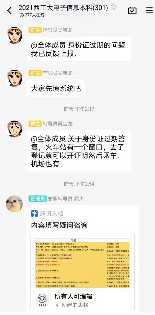 吴老师提到,他认为自己日常工作中遇到的最大困难是在封宿管理初期,年级中有一两个同学偶尔没有做核酸检测。为了解决这个问题,他组织各班每天轮值的班委在当天最后一次核酸检测的时候督促自己班级的同学,在群里报自己班的是否已全做的报告,成功达成“全员核酸,不漏检一人。”