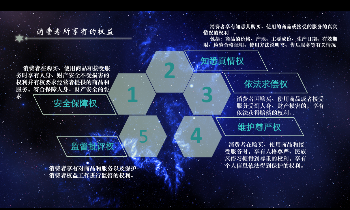 消费者的权益一共有九个:安全保障权,知悉真情权,自主选择权,公平交易权,违法求偿权,求教获知权,依法结社权,维护尊严权,监督批评权。