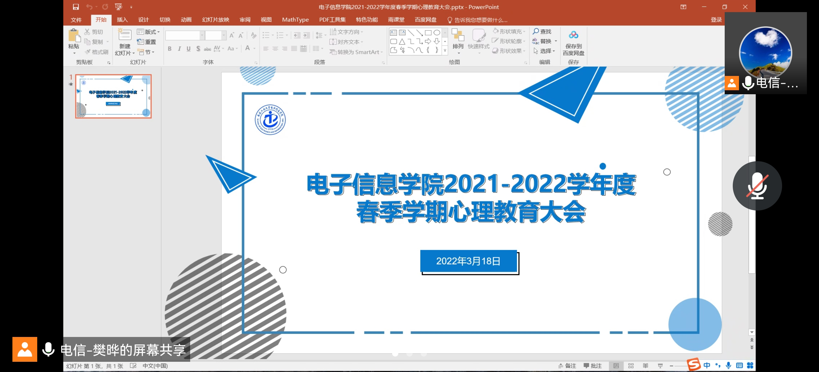 3月18日晚6:30,知心阁负责人樊晔主持线上会议。本次会议从机构简介、工作开展情况、学生帮扶情况等三个方面向大家介绍了西北工业大学电子信息学院的心理工作及未来工作思路,同时鼓励同学们积极面对心理波动问题,发现问题可以寻求班主任、辅导员以及知心阁的帮助,及时解决。同时,会议介绍了本学期第一次周末活动日,并向各位同学发出了真挚的活动邀请。