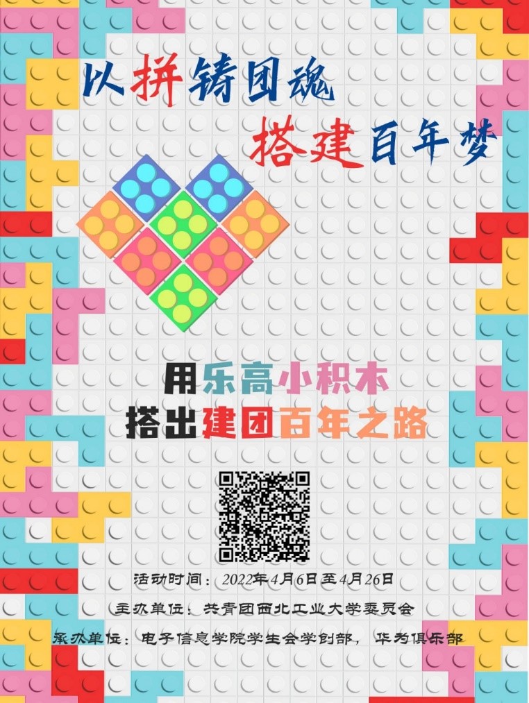 桃红柳绿春风暖,莘莘学子汇长安。在这春意盎然的四月,电子信息学院IF创想工坊,以“拼”铸团魂,“搭建”百年梦--积木搭建活动正式拉开帷幕。2022年正值中国共青团建团100周年,对于团的百年建设、发展与壮大历程,相信同学们都有着切身体会和深刻认识,心中是否也燃烧起创作的激情呢?本次活动便为同学们提供了一个自由创作的平台:参赛者以简单的乐高小颗粒积木为原材料,在规定时间内创作出富有时代感的作品,并在指定的时间内交到电子信息学院统一进行打分,评委会从中评选出富有新意、充满活力的优秀作品。同学们,还在等什么,快来尽情挥洒自己的灵感吧!