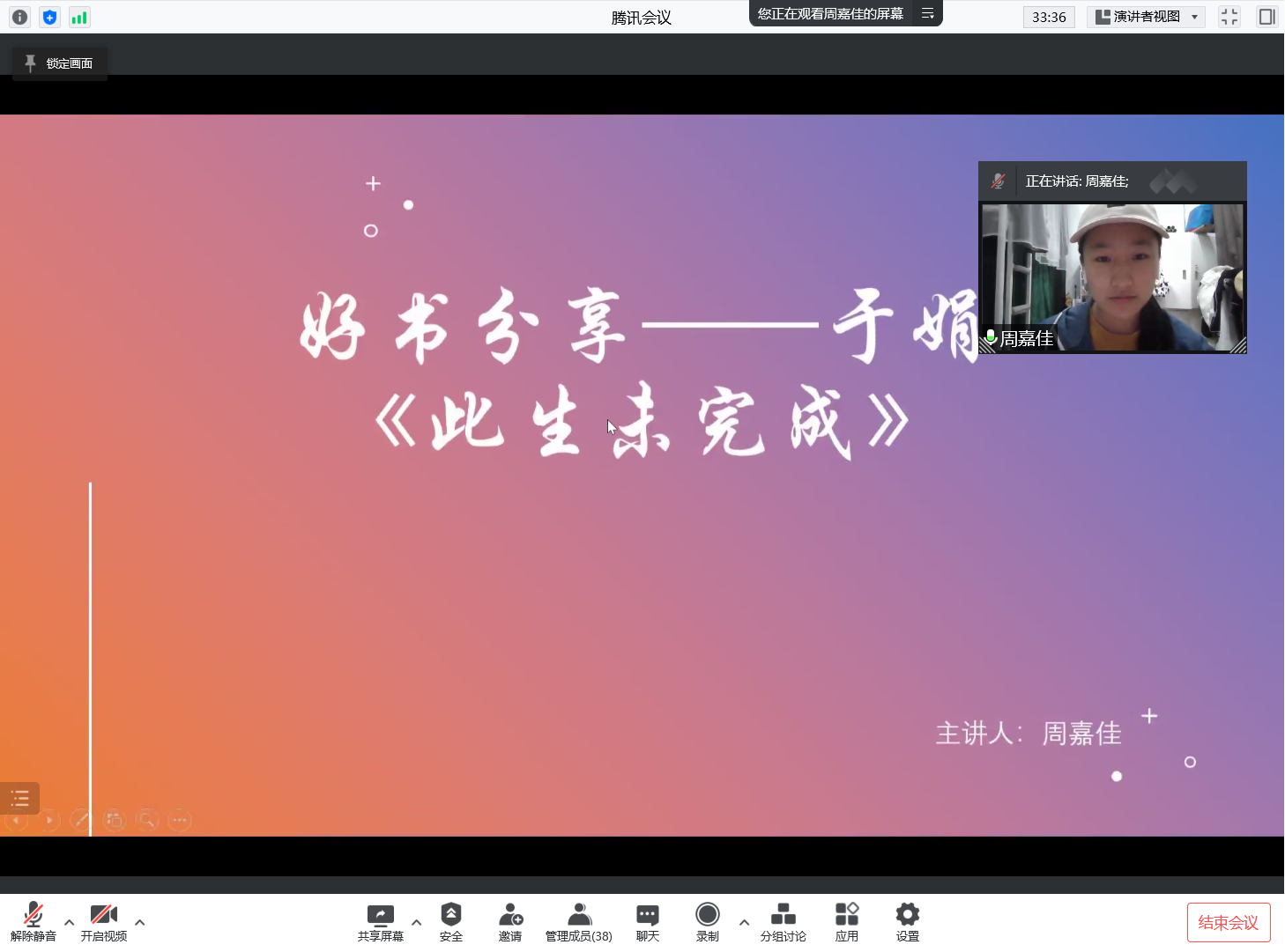 4月15日晚上,由我校党委学工部主办,电子信息学院承办的“微拓”-WE TALK学术沙龙第150期通过线上会议的形式举行。本次活动主题为“好书分享—于娟《此生未完成》”,主讲人周嘉佳是电子信息学院2020级本科生,曾获国家励志奖学金、校二等奖学金以及社会服务先进个人、学业先进个人、“优秀共青团员”等荣誉表彰。