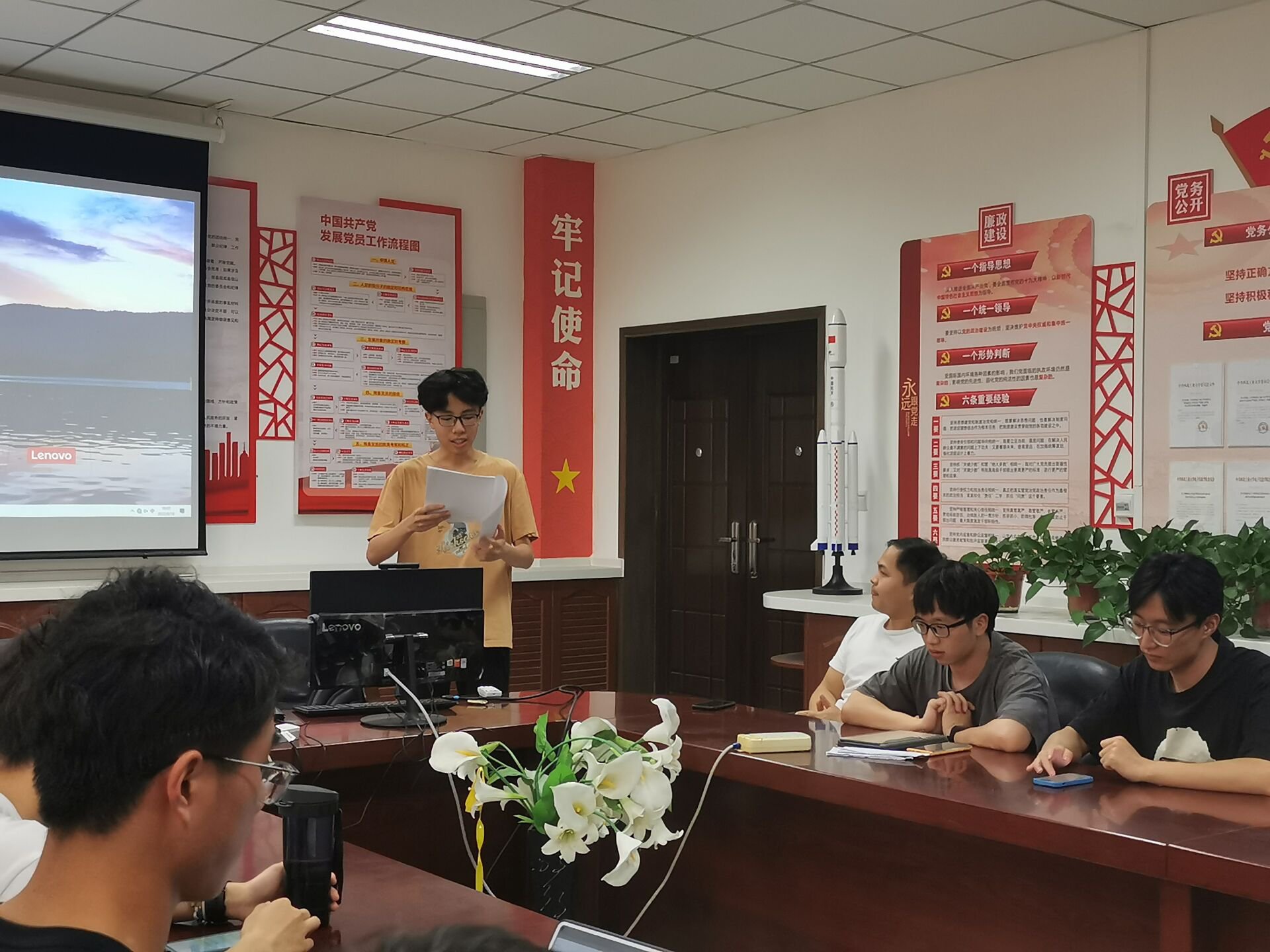 根据接收预备党员大会流程,首先由杭瑞杰、黄滋航、明星、龙琳、朱新生5位预备党员宣读转正申请,详细汇报其在预备期间的表现,并对自身在思想、学习和工作各方面的进步及存在的不足做详细总结。随后由培养联系人和与会党员对转正申请人在预备期间的各方面表现进行评价。最后,经正式党员投票表决,支部同意杭瑞杰等5位同志按期转为中共正式党员。