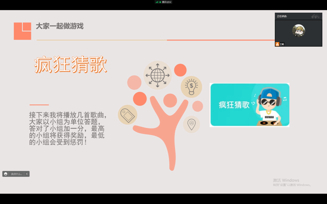 接下来的第二个游戏是“疯狂猜歌”。以小组为单位,由班级组织委员播放音乐,各组成员听前奏来猜出歌名,通过抢夺按铃获得答题权,在规定的时间猜对歌名小组成功加分,得分最高的小组胜利。胜利团队成员可以指定任意同学进行才艺展示,得分最低的小组全组表演才艺。组织委员在耳熟能详的歌曲中穿插了不少老歌,调动了同学们热情的同时也增加了游戏难度,使活动氛围推向高潮。