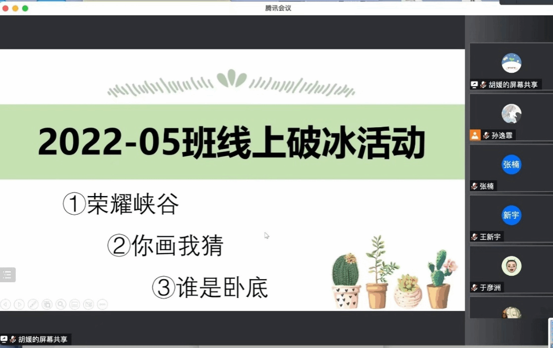 四班通过线上视频的方式,加强同学们的参与感,增进同学们的友情。五班班委经过协商列举了包括眼色游戏、数字地雷等在内的多个游戏供大家投票,最后你画我猜、谁是卧底、荣耀峡谷等游戏以高票胜出。借助游戏APP、游戏小程序等工具同步进行,最大程度保证每位同学参与进来、增进友谊。