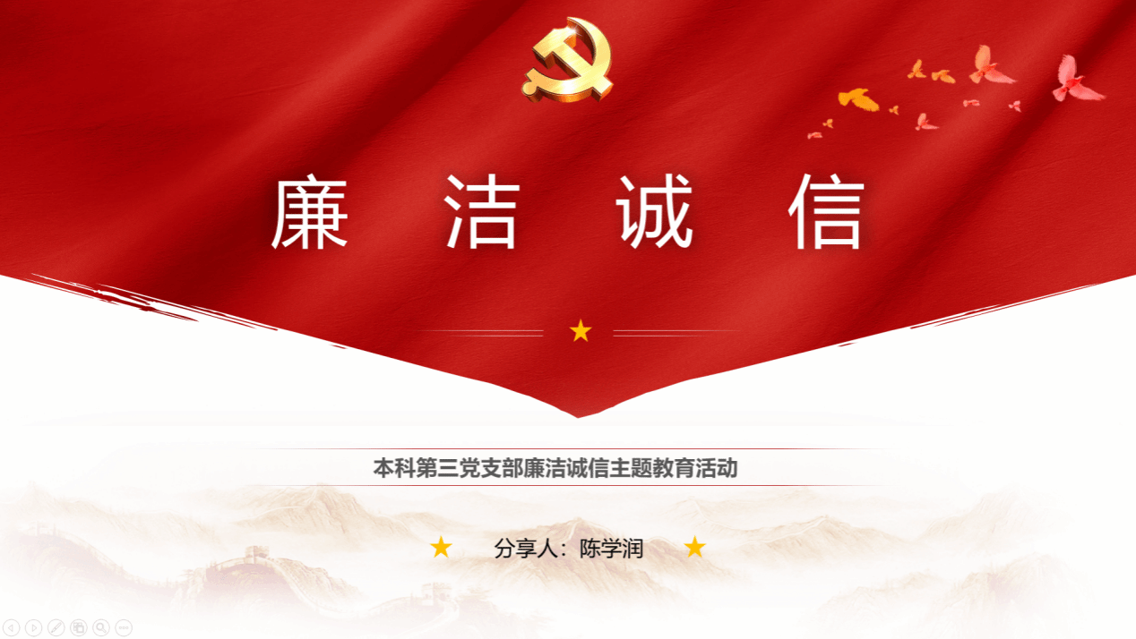 2022年11月28日,为了更好的学习和理解党的二十大报告中关于廉洁诚信的部分,同时让党员同志们以积极乐观的心态应对即将到来的期末考试,电子信息学院本科第三党支部以线上的方式召开了“廉洁诚信,从你我做起”的廉洁诚信主题教育活动,由保密委员陈学润同志为大家分享有关内容。