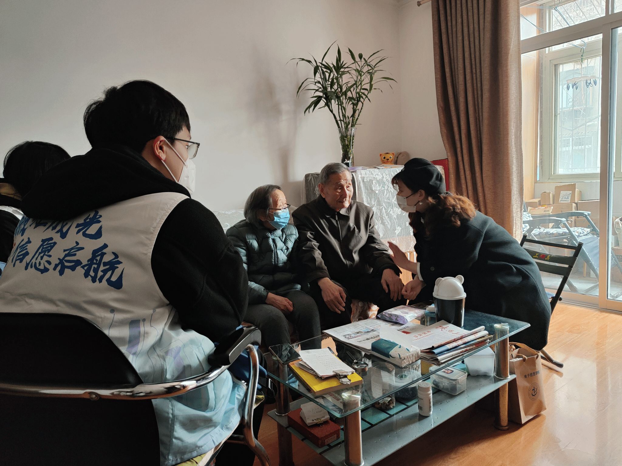第三组志愿者们前往了张奶奶和王奶奶家,为老人送去由电子信息学院指导学生自制的精美围巾,贴心探望并陪伴老人。张奶奶是一位退休的医生,在日常生活中喜欢与老伴一起吟诗、看报。在拜访的过程中,我们感受到了张奶奶强烈的时尚感与求知欲。志愿者们不仅教她如何用手机点外卖、如何卸载手机软件以及如何网上预约医院挂号等,还为张奶奶取消了无用的手机额外套餐,帮助其设置支付宝长辈模式,并为其关闭了无用广告推送。经过了四十分钟的简单学习,张奶奶已经可以自主完成这些网上操作,老人家对志愿者们的工作提出表扬并欢迎他们常来。