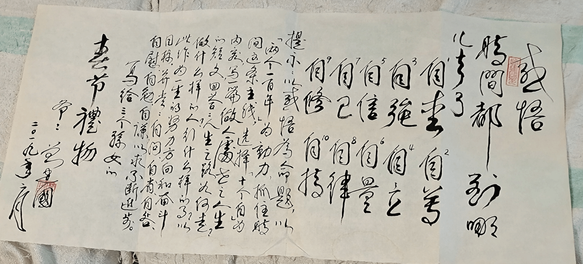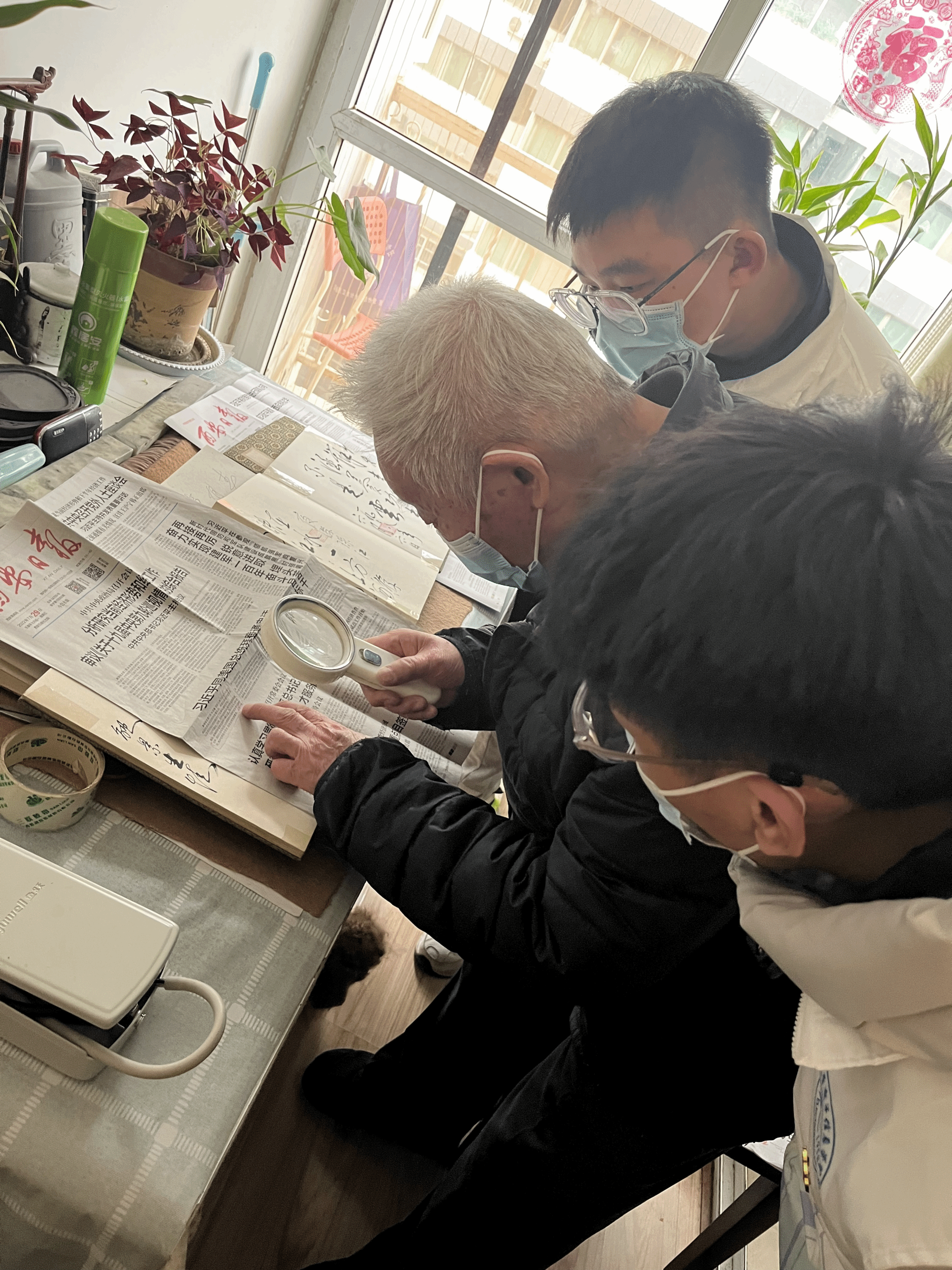 第二组的同学来到了金色时代七楼的曾爷爷家,曾在西工大任兼职研究员的他是一个文化底蕴深厚,热爱读书看报和写书法的老人,同学们帮助曾爷爷找到了指定的报纸,并帮爷爷粘好了书法册,张贴了写好的书法。作为感谢,曾爷爷分享了他送给三个孙女的春节礼物,教导同学们要做到自爱、自尊、自强、自立等十个“自”,以“两个一百年”为动力,抓住“时间”这条主线,思考做什么样的人,并把此作为一生的努力方向和奋斗目标,以有所进步和提高,鼓励同学们努力学习,为祖国做贡献。