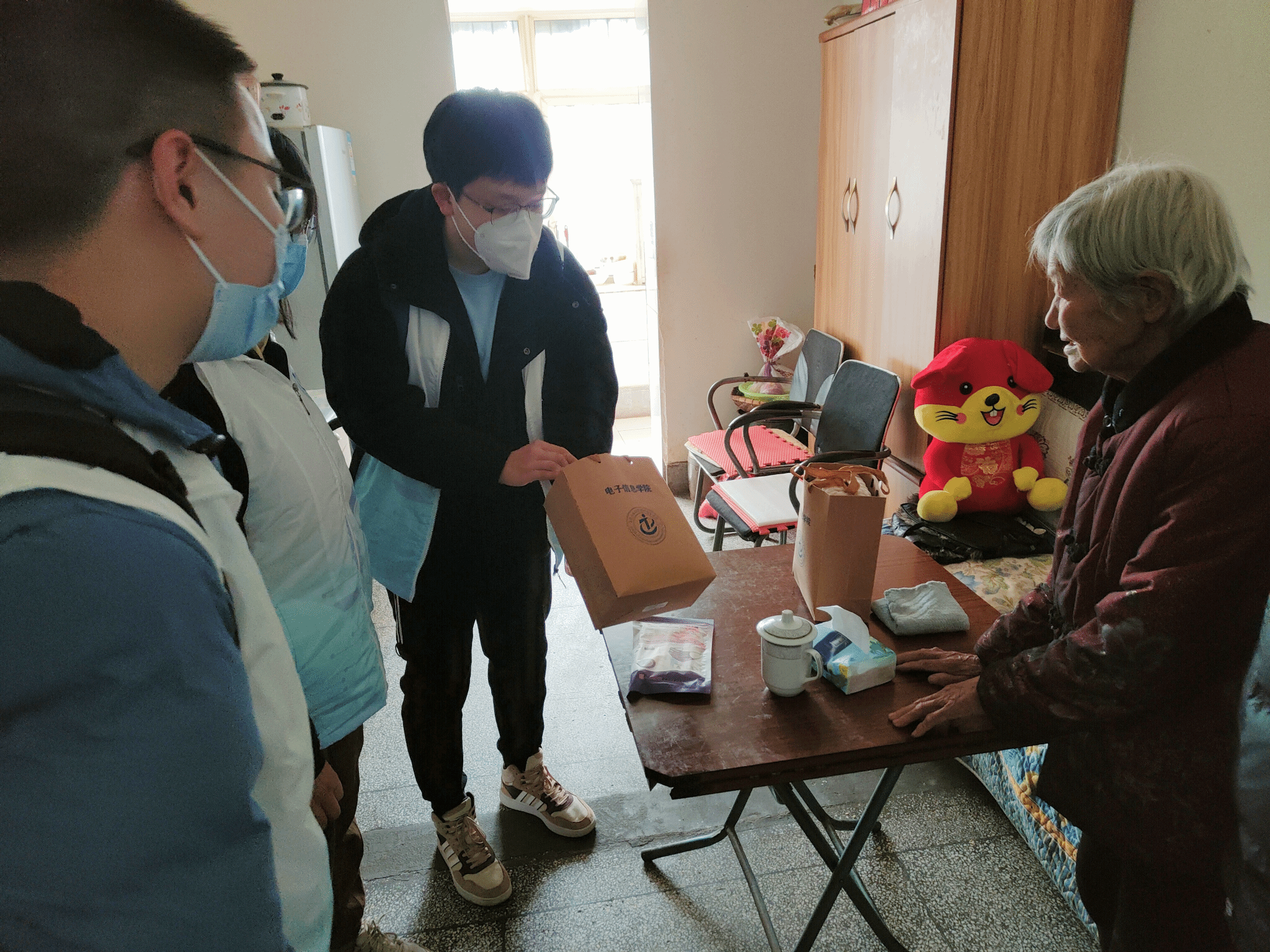 随后四名志愿者又前往了王奶奶家。王奶奶患有轻微的阿尔兹海默症,有儿孙常年陪伴照顾,因此志愿者们选择与王奶奶谈谈心,关心老人的身体,询问生活近况。递过爱心围巾时,王奶奶一家表达了衷心的感谢。一番交流下来,志愿者们发现王奶奶虽然已年过耄耋,却也有一颗年轻的心,网上充电费、网购可谓是样样精通,堪称是是一位时尚小达人。