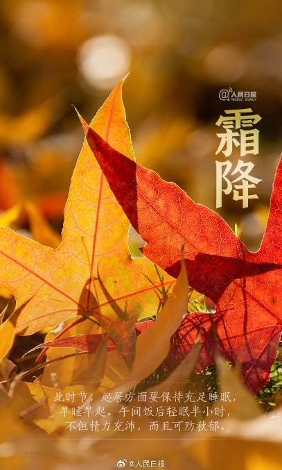 霜降时节,万物毕成,毕入于戌,阳下入地,阴气始凝,天气渐寒始于霜降。由于“霜”是天冷、昼夜温差变化大的表现,故以“霜降”命名这个表示“气温骤降、昼夜温差大”的节气。
