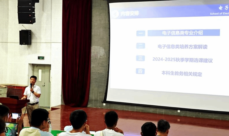 9月2日下午,学院副院长高永胜、以及电子信息工程专业负责人戴玉超、通信工程专业负责人李立欣、电子科学与技术专业教师张冠文、探测制导与控制技术专业教师杨啟明及本科教务科室主任杨瑾,为全体本科新生带来了干货满满的“学业指导与专业认知”主题讲座。