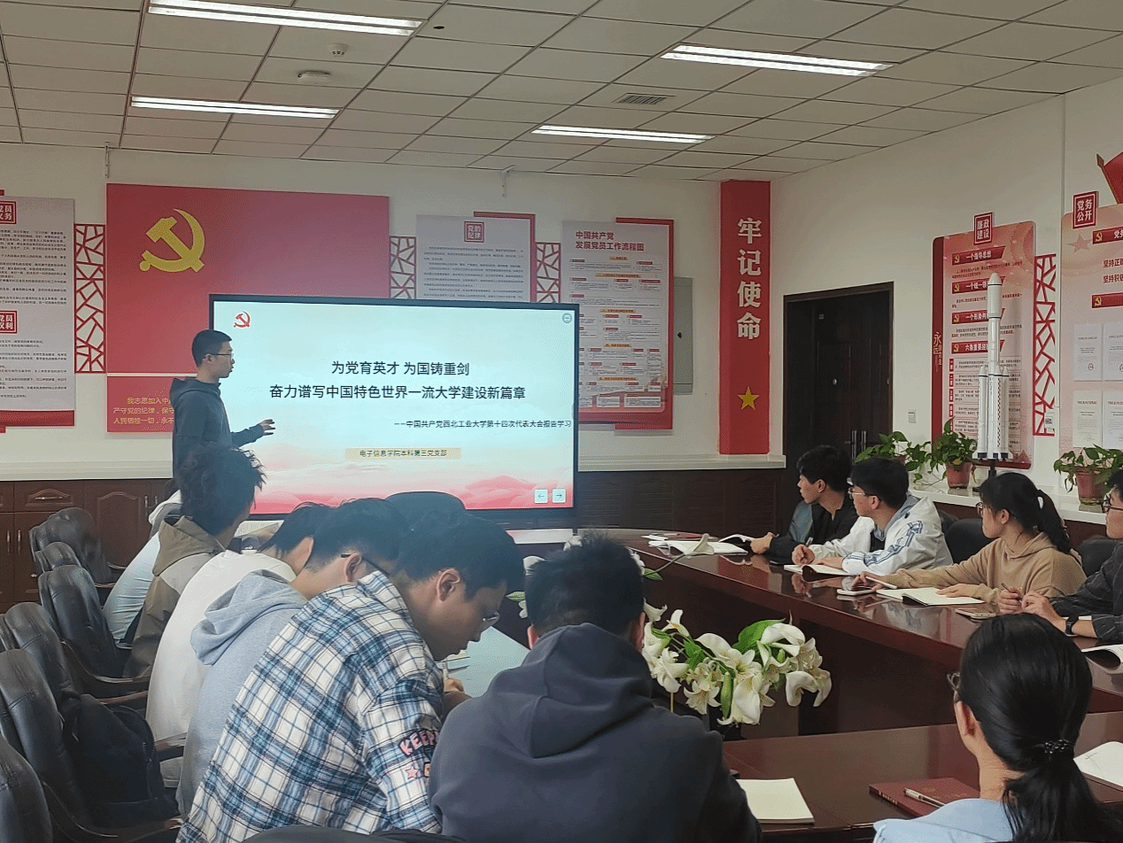 2024年10月11日,本科第三党支部召开党员大会,组织全体党员深入学习宣传中国共产党西北工业大学第十四次代表大会的报告,旨在深刻领悟会议精神,统一思想,明确方向,为推动支部的高质量发展贡献力量。本次党员大会由支部书记吴艺博主持,支部全体党员参加。