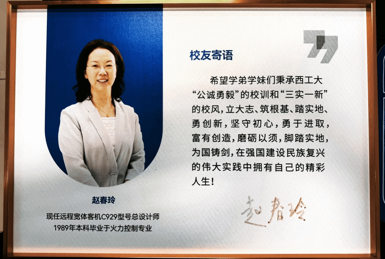 赵春玲,1989年本科毕业于电子信息学院火力控制专业,现任远程宽体客机C929型号总设计师,曾任ARJ21飞机型号航电电气副总设计师。先后参与航空工业多项国家重点型号研制和预研项目工作,先后参与中国商飞三型商用飞机ARJ21、C919、C929的研制工作。荣获国家科技进步一等奖1项、省部级以上科技奖20余项。荣获全国三八红旗手、上海市三八红旗手标兵、上海市先进工作者、上海市领军人才等荣誉,受国务院特殊津贴,全国妇女十三大代表。