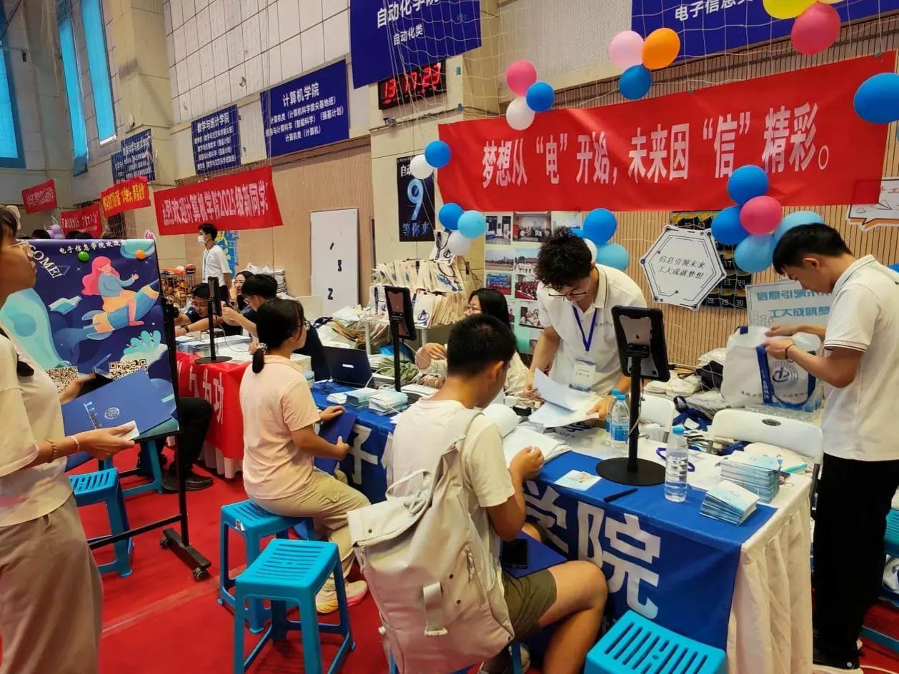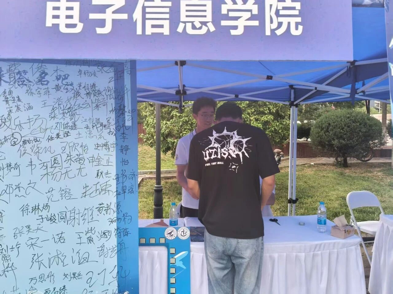 早在七月中旬,电子信息学院便启动迎新筹备工作,成立由院领导牵头的迎新专班,多次召开协调会细化流程,从报到动线设计到物资保障清单逐一敲定。迎新两天,学院专属迎新区域内,蓝白相间的展板清晰标注报到流程,“梦想从“电”开始,未来因“信”精彩” 的醒目标语,文化衫、鼠标垫、钥匙扣、帆布袋等学院专属小礼品让新生初入校园便感受到专业氛围。新生签名活动也吸引了众多学子的积极参与。硕大的签名板矗立在外场报到区中心,成为新生们踏入大学校园后第一个颇具仪式感的打卡点。新生们有序排队,满怀憧憬地拿起签字笔,在签名板上郑重留下自己的姓名。笔迹或工整清秀,或洒脱豪迈,每一个名字都承载着一个崭新的梦想和对未来四年的无限期待。