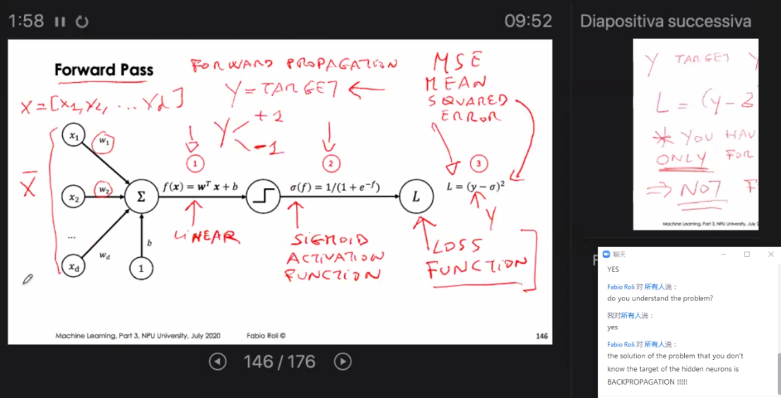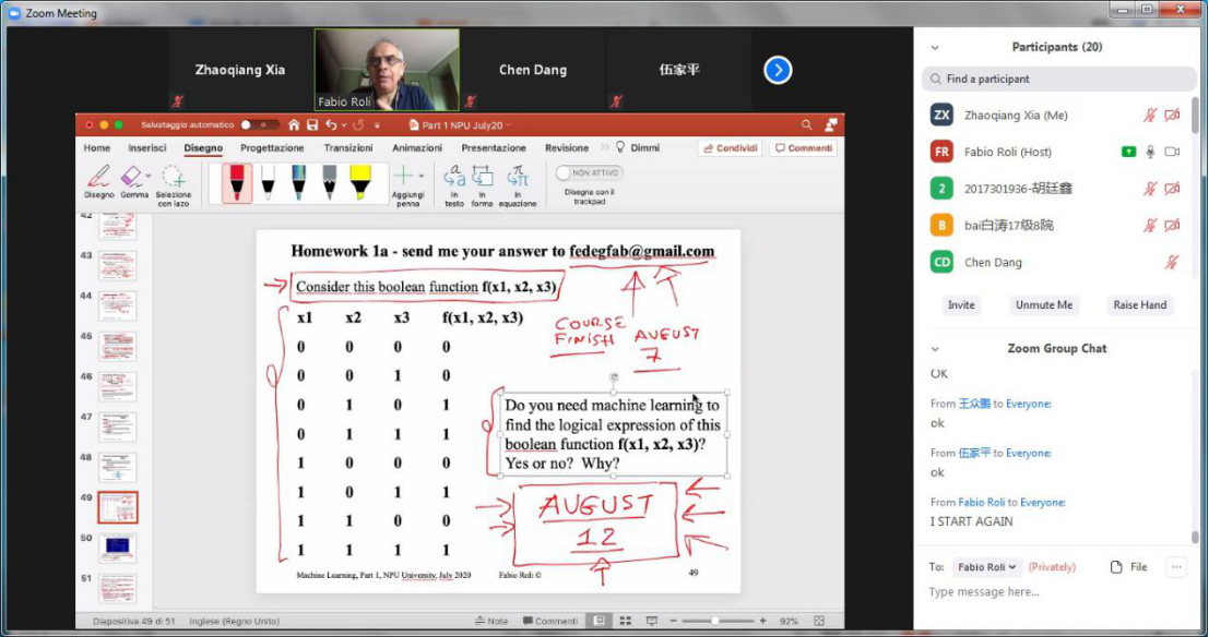 Adversarial Machine Learning /对抗机器学习暑期课程共32学时,Roli教授的授课在Zoom会议软件上进行,授课进行了3周,每周工作日有4天的下午3:00到5:30(北京时间,罗马时间早9:00-11:30)在线授课。他的讲课将机器学习基础知识和对抗学习前沿研究相结合,共分为4大部分内容:1)介绍课程主要内容,同时讲解机器学习的基本概念和任务流程;2)从贝叶斯决策理论和高斯模式分类器入手,讲解统计学习方法的理论基础;3)通过讲解分析机器学习分类器设计中不同的损失函数,从优化理论的角度将简单线性分类器过渡到深度神经网络,并讲解了卷积神经网络(CNN)的结构含义;4)从一些现实中的机器学习分类错误的例子引入,讲解对抗学习的基本概念、理论基础、应用领域和研究趋势。整个讲课过程中,Roli教授与学生全英文互动进行问答,在每一个知识模块讲解完成后都会询问学生们是否理解明白,没有全部理解的部分Roli教授会耐心地详细讲解。在一些数学推导内容较多的部分,Roli教授会亲自板书推导相关内容以便同学们理解;在一些介绍一些机器学习框架时,Roli教授还会介绍相关编程框架及附上网站链接,方便同学们课下自行实践学习。