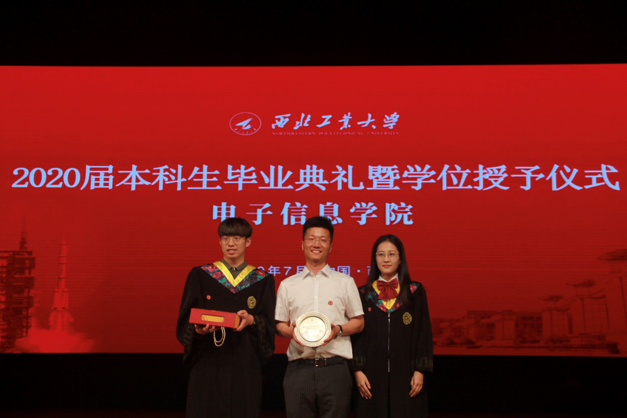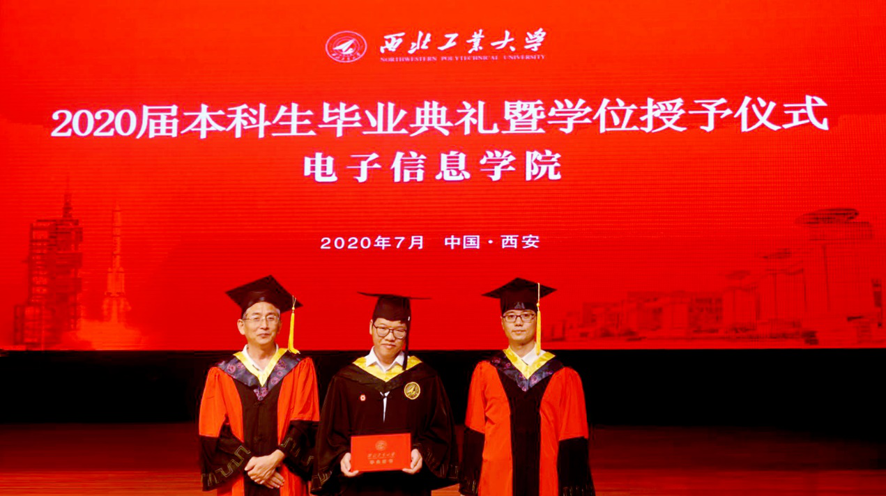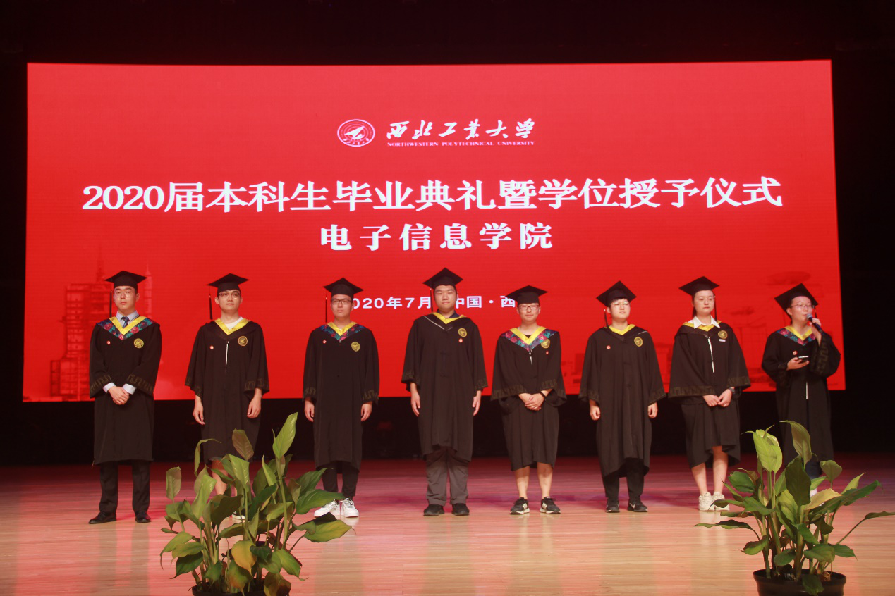 风雨萃英路,薪火传后人。中华灿烂,工大无疆!电子信息学院2020届全体本科毕业生合唱《西北工业大学校歌》,歌声悠扬,字字铿锵。学院学术委员会的四位老师王伶、李建瀛、冯晓毅、周巍为同学们一个个拨穗、颁发毕业证、合影留念。