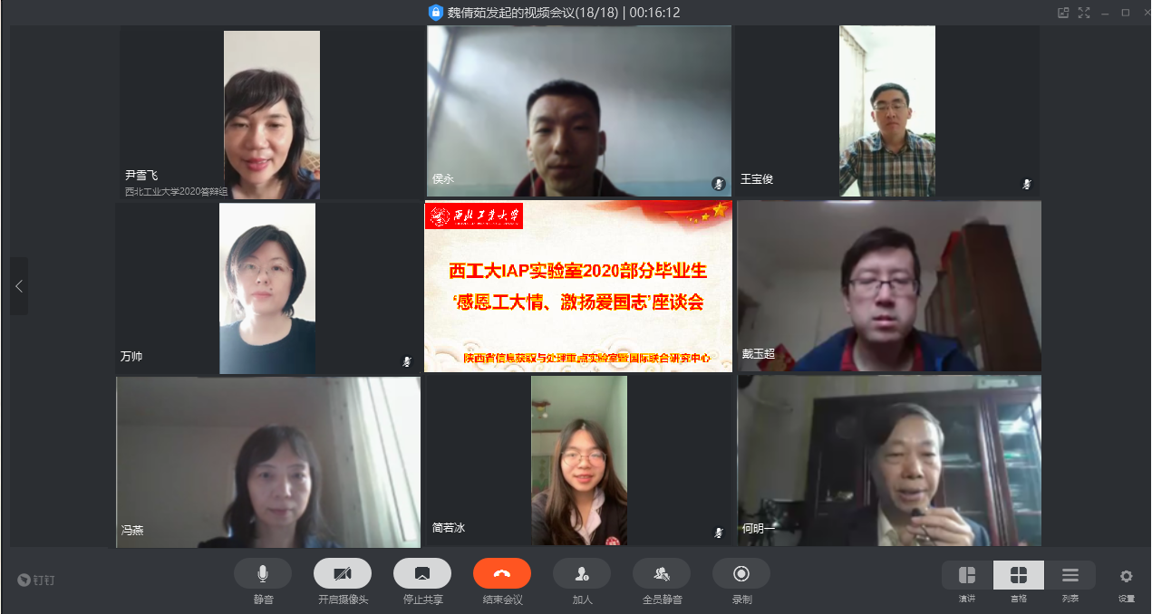 3月26日上午,陕西省信息获取与处理重点实验室暨国际联合研究中心(简称IAP)2020年部分毕业研究生“感恩工大情、激扬爱国志”视频座谈会成功召开。IAP的10余位2020届毕业研究生和在校研究生代表,IAP实验室创始人、中心主任何明一教授,实验室主任戴玉超教授、副主任冯燕教授、万帅教授等老师应邀出席了视频座谈会。座谈会由实验室副主任冯燕老师主持,参加座谈会的还有尹雪飞、魏倩茹等老师。