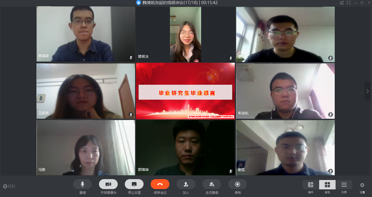在线座谈会上,2020届毕业生代表们积极畅谈校园和实验室的愉快生活,分享取得的成绩,感恩老师、实验室和学校的培养,并表达爱校、报国的情怀。李泽政同学在读研期间参加了多项全国和地方性竞赛,获得了全国和西北地区一等奖等多项奖励。他说这些成绩的取得要感谢导师对他的悉心栽培,感谢其他老师的教育和实验室同学们的帮助,感谢学校提供的多个机会和一流平台。郭锦坤同学说,在未来科研和工作的过程中还要对知识的广度和深度进一步拓展。侯永同学在研究生期间发表了SCI论文、申请了发明专利还获得专项奖学金,他说毕业后将“走出舒适圈”,迎接未来新的挑战。王宝俊、李烁、朱治东和王凯悦等同学也先后分享了自己的读研经历与取得的成绩,并且表示了对导师、任课教师和学校的感激之情。2018级研究生简若冰代表在读研究生祝贺学长们圆满毕业,并祝愿他们今后工作顺利、身体健康、家庭幸福。