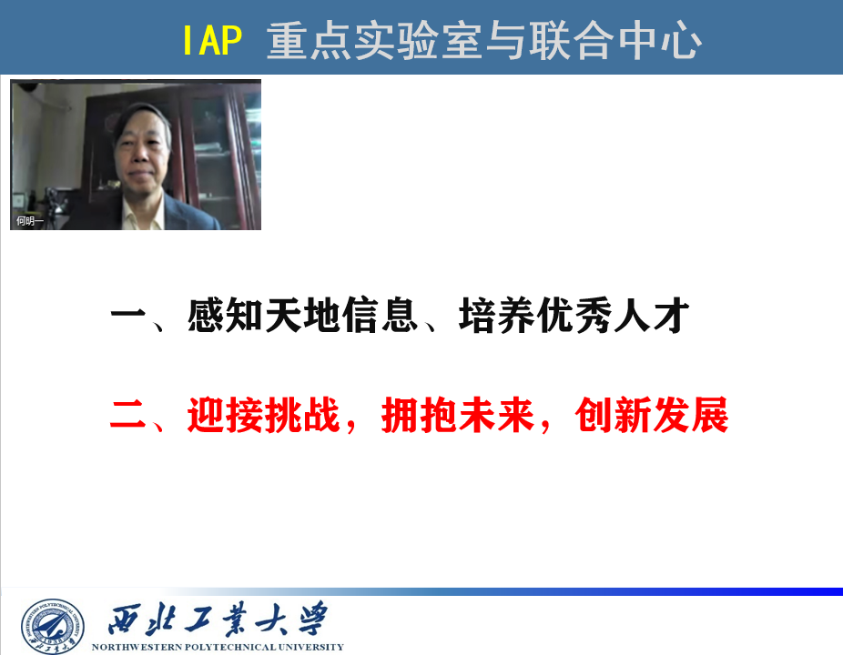 IAP实验室创始人、中心主任何明一教授应邀为同学们上了“最后一堂课”。何明一老师首先简要回顾了IAP信息获取与处理重点实验室及国际联合研究中心的创立、发展及在研究生培养中的作用,祝贺同学们在参与IAP“感知天地信息、培养优秀人才”的实践中取得的优秀成绩和顺利毕业。何老师与同学们共话美好校园与实验室生活,为同学们在信息获取与处理领域的学习、研究取得的进步和成绩感到非常欣慰!何老师寄语同学们“迎接挑战,拥抱未来,创新发展”。他对同学们提出了几点具体的期望:一是要有责任感和善良心,二是要在今后工作中传承和弘扬西工大“三实一新”校训精神,三是要坚持信念、顺应时代、拥抱未来、积极加入到新时代国家建设与发展的行列,努力实现自己的理想。最后,何老师深情地对毕业生们说:“这里是你们的家”,实验室和中心以后还将继续为你们提供可能的支持和帮助,也欢迎你们“常回家看看”。