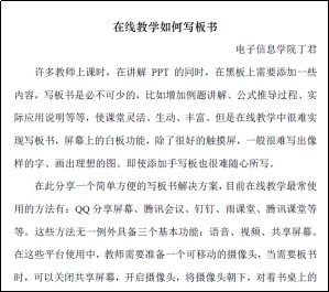 学院成立在线教学督导组,与学校在线督导组形成联动机制,对学院开设课程全覆盖,通过在线随机抽查、随堂听课等形式,对在线教学过程进行督导和评估。在开学第一周,督导教师加入每门在线授课的QQ群及平台,对在线课堂教学、学生学习情况等方面进行检查,并与授课教师就上课平台的选择以及可能出现的问题进行交流和探讨。学院督导丁君老师还总结了《QQ分享屏幕教学方法》、《在线教学如何写板书》两篇在线教学解决方案,并及时分享给全院教师,为改进线上教学方式,提升线上教学效果,提出了好的建议。