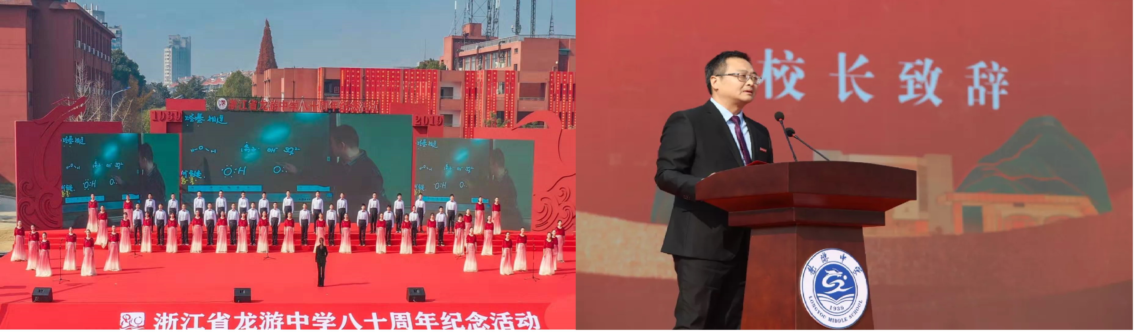 和风暖日,鸡鸣山下喜迎四方宾朋,2019年12月15日上午9时30分,浙江省龙游中学“感念龙中 有你有我” 建校八十周年纪念活动在校运动场主会场隆重举行。精彩的开场节目过后,龙游中学校长吴焕斌致欢迎辞,对莅临本次大会的领导、来宾和校友表示了衷心的感谢。传承唯诚求实精神,培育本真大器新人,在龙游中学建校八十年之际,吴校长回顾了八十年来的坎坷历程,展望了学校未来的发展蓝图。我校发去了贺信,表达了我校对龙游中学80周年华诞的热烈祝贺和诚挚祝福,并派浙江招生宣传组成员冯琦老师参加庆典活动。
