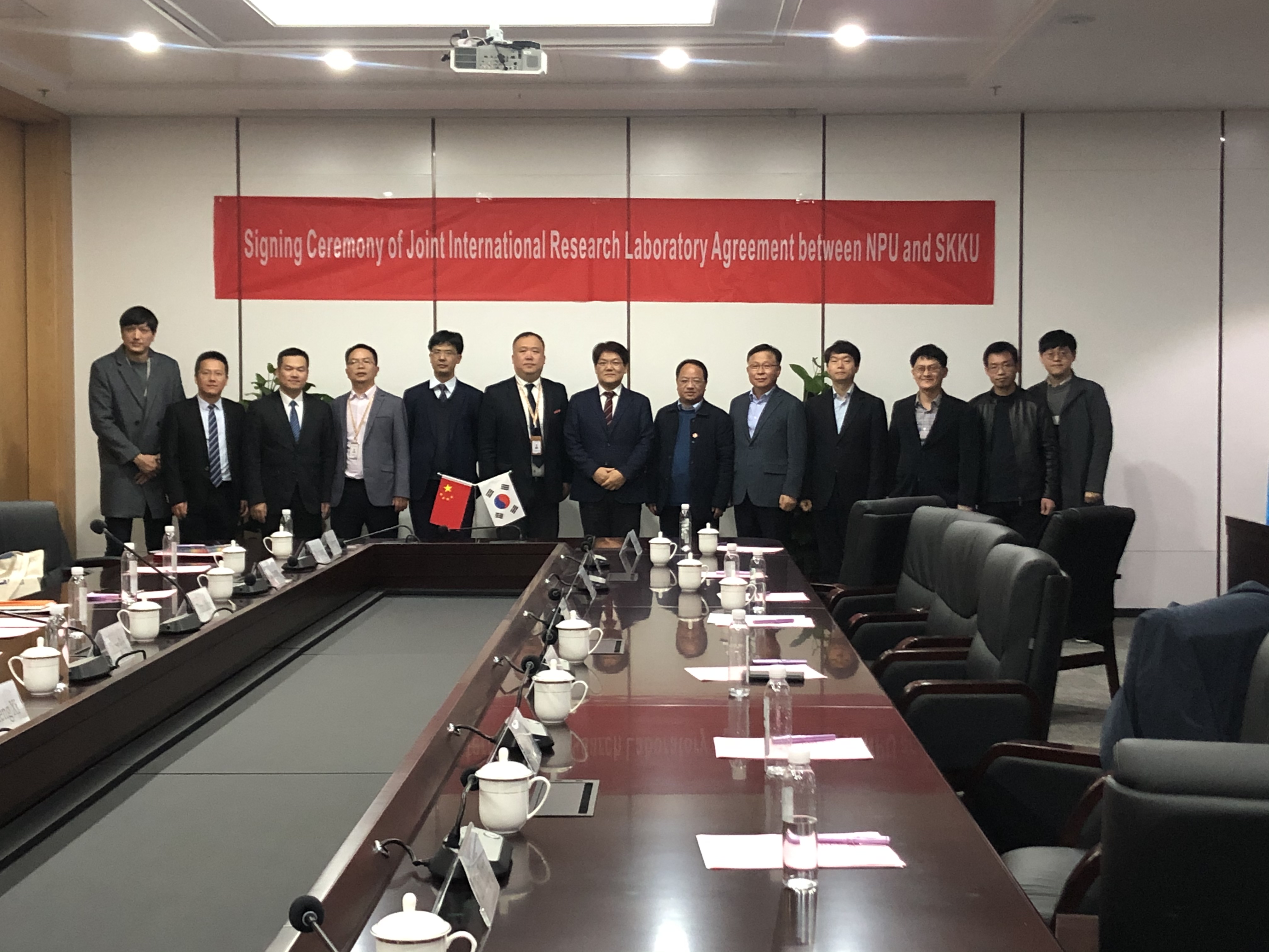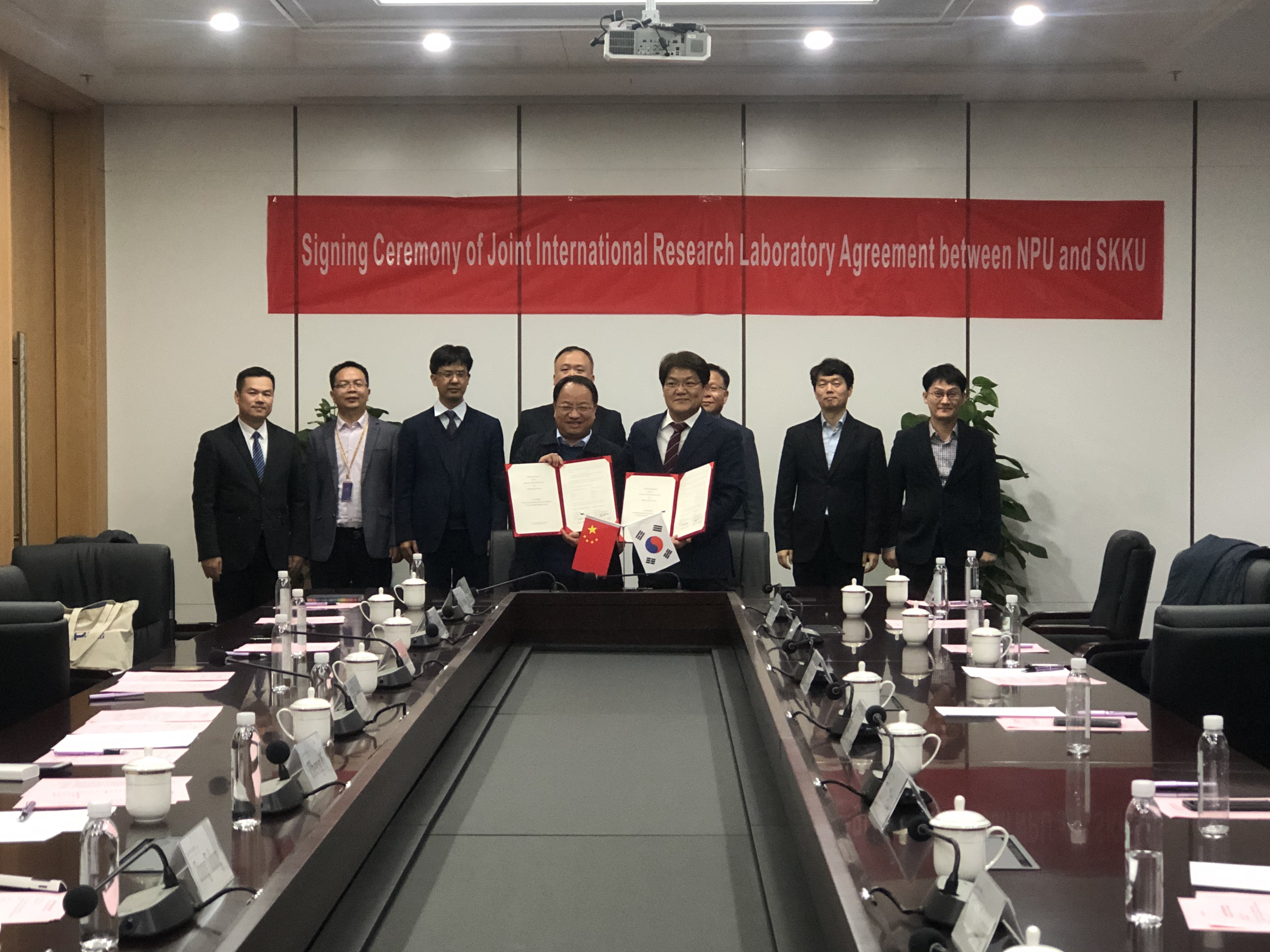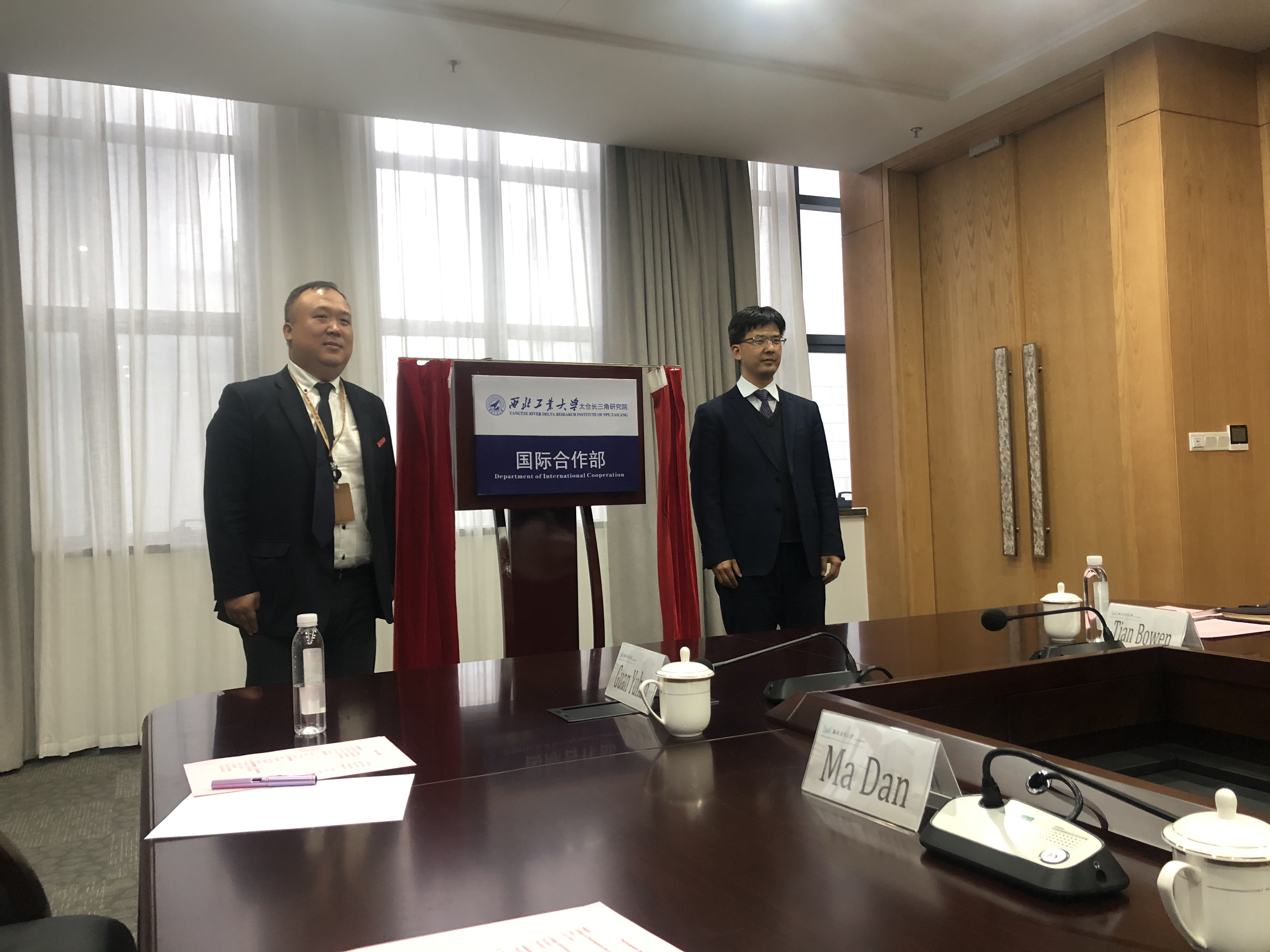 随后,访问团就太仓校区、长三角研究院建设发展情况,建立西工大-成均馆大学联合研究实验室进行座谈交流。郑曦常务副院长代表长三角研究院与太仓校区管理委员会热烈欢迎访问团一行的来访;长三角研究院张铁邦副院长介绍了长三角研究院情况;周德云院长简要介绍了我校和成均馆大学关于合作办学的进展和筹备情况,并介绍了国际联合研究实验室的科研方向和目标;张富利处长表示大力支持我校和成均馆大学的合作办学,并提出了明确要求;郑曦常务副院长作了总结发言,代表太仓校区管委会和长三角研究院表示大力支持我院与成均馆大学建立国际联合实验室落户太仓。座谈结束后,June-Ho Yi院长和周德云院长签署了国际联合研究实验室合作协议;张富利处长和郑曦常务副院长共同为长三角研究院国际合作部揭牌。