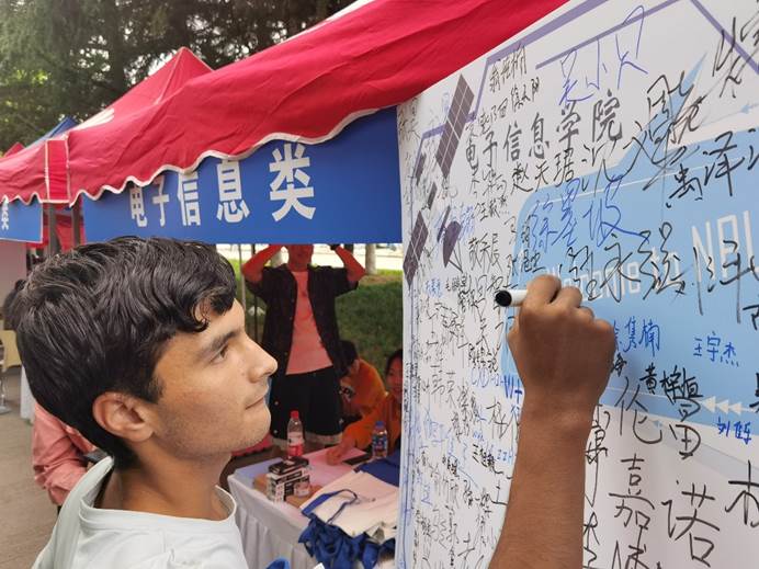 外场咨询活动如火如荼,各位工作人员为新生细致讲解报到及入学问题,为新生在学校的生活提供咨询帮助。朝气蓬勃的新同学领取了学院准备的“入学大礼包”,并在签名板上留下自己的“开学第一笔”。