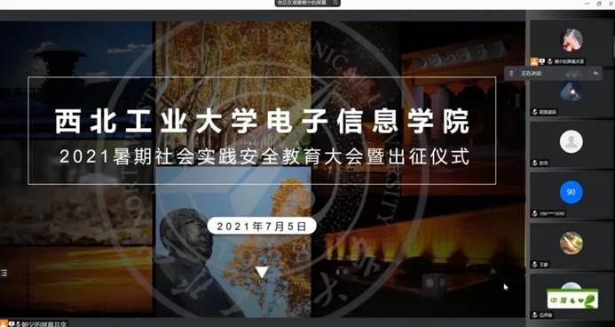 7月5日,电子信息学院举办线上2021暑期社会实践安全教育大会暨出征仪式,引领学生深入理解《永远跟党走——百年初心路·壮阔新征程》的实践主题,进一步感悟中国共产党如何领导新中国走向复兴之路。