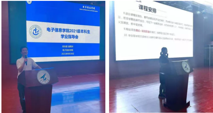 高永胜副院长从学科专业的角度为同学们介绍了电子信息学院五个专业以及电子信息类课程的设置,就2021级电子信息类培养方案中通识通修、学科专业课程设置做了详细讲解,着重给出了2021-2022学年秋季学期的选课建议,同时也对同学们寄予了厚望,希望同学们在未来四年的学习生涯中,胸怀理想、学有所长、奋发图强。