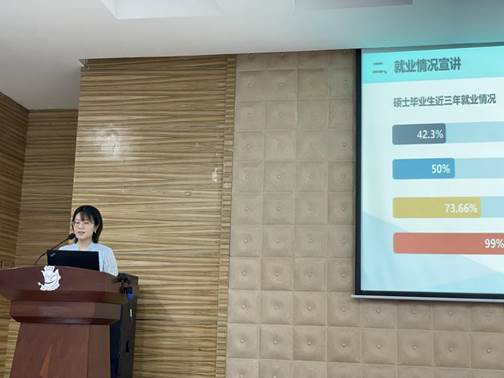 最后,冀璐阳梳理了我院硕士毕业生的就业情况,从就业信息获取、三方签订、违约办理等方面为同学们详细讲解了就业注意事项。结合近三年硕士就业情况,我院毕业生总体就业率达99%以上,航空、航,天、航海、兵器、电子等国防科技和工业、通信等国家重点领域就业比例达73%以上。在择业过程中,她还提醒各位同学要抢抓机遇、理智抉择、审慎签约、诚信为本,在收集就业信息时要多方面多渠道出发,在面试过程中要保持自信,签订三方则一定要认真谨慎。