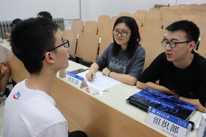 经过2天的报名阶段,电子信息学院团委、学生会于9月10日、11日晚,在教西B205、206进行了现场面试。各部门负责人准备了具有针对性的考查问题,与新生展开面对面的交流,各部门面试工作有序进行。