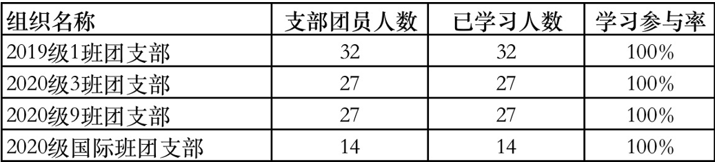 在本期青年大学习中,电子信息学院团委各支部积极贯彻落实学校相关要求,一起学党史,强信念,跟党走。本科支部18级和研究生支部较上期学习参与率有所提升,20级学习参与率全部超过60%;其中,共有4个支部学习参与率达100%,分别是:19级1班,20级3班、9班和国际班,在此对这些团支部提出表扬!