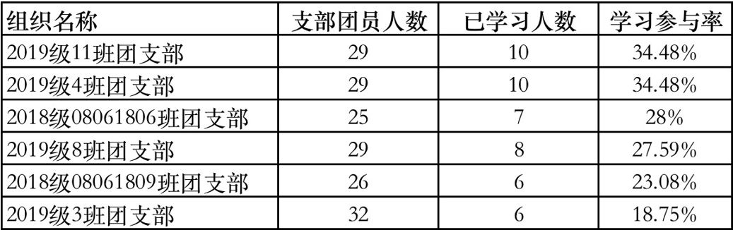 然而,本科18级、19级仍有许多班级参与率低于40%,希望这些班级在之后的学习中能够提高学习积极性,向参与率较高的团支部汲取经验,按时组织完成学习任务。